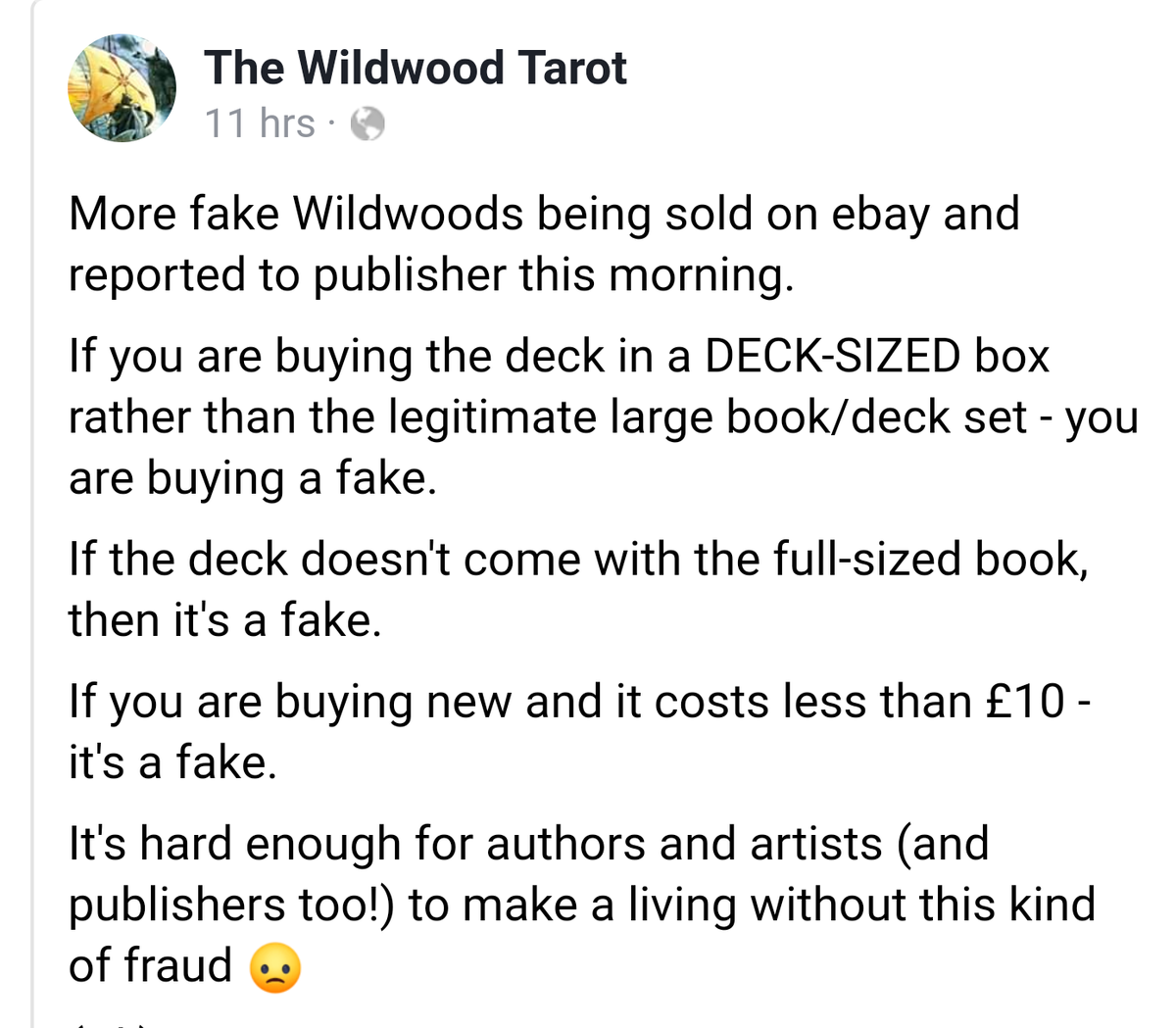 Wanderer Posted June 8, 2019 Posted June 8, 2019 (edited) This is really quite sad, and I hadn't realised it was happening. It's not as if it's an horrifically expensive deck to buy, anyway - I can imagine some of the really luxurious or limited edition decks attracting the fraudsters, but the Wildwood? I guess popularity would work as well - if they sell enough of them, it's worth the risk... unfortunately. Edited June 8, 2019 by Wanderer