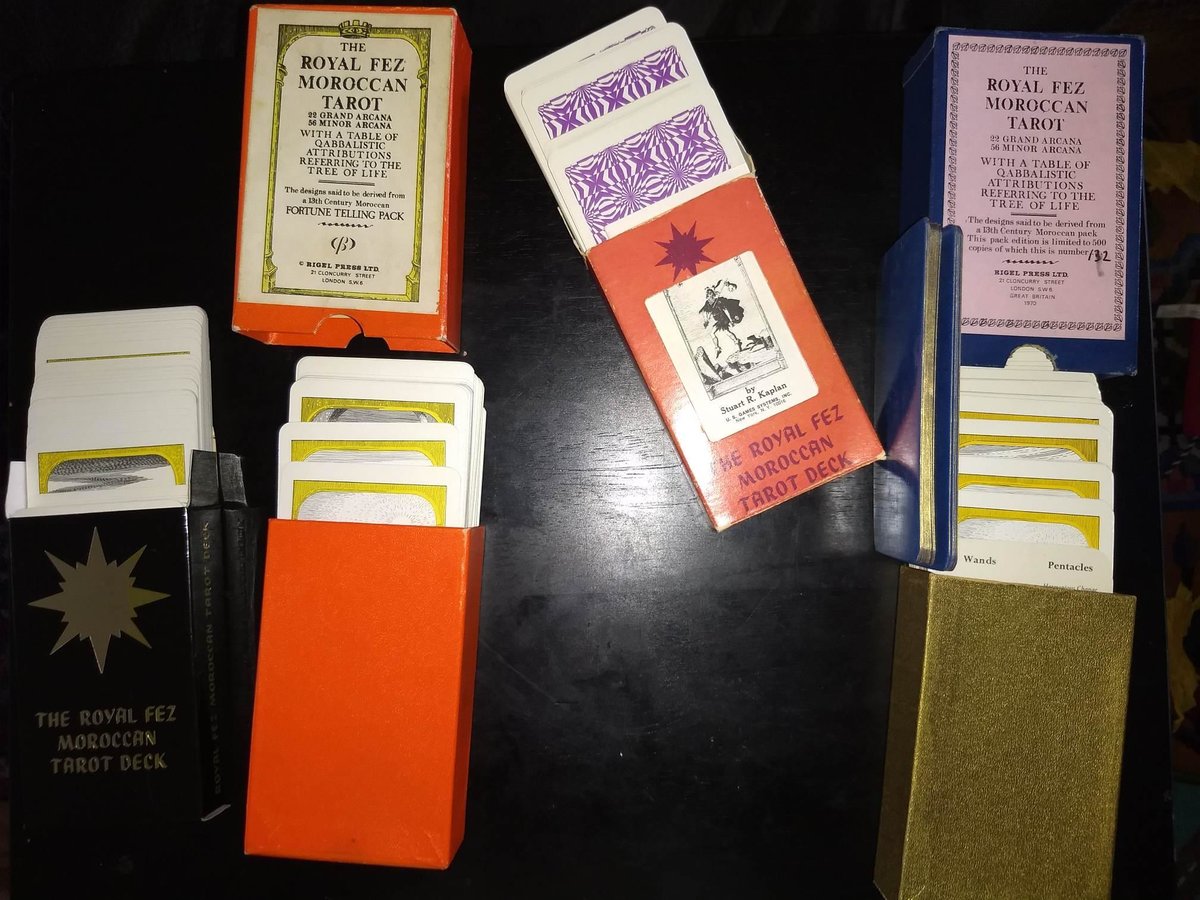 Orli Posted June 20, 2019 Author Posted June 20, 2019 (edited) 3 hours ago, BrightEye said: Hello Orli, I'm so sorry to hear about your mother. But what a marvellous collection she had! You list several versions of the Royal Fez Morrocan Tarot, is that correct? Would you have pictures and publication details? And how much would you want for each one of them? Thank you. Hi TT&M Family, Attached is 4 of Royal Fez decks, there may be more, I'm not sure. The one on the right is #32 of 500. They're all worth quite a lot: https://tinyurl.com/y2jxm5ur https://tinyurl.com/y3zvb532 If you'd like to make an offer, please email me at zeanrw@gmail.com. I will also be making a listing on ebay today, so keep an eye out. I listed a rare Magnas Veritas deck yesterday and it sold the same day. https://www.ebay.com/usr/tarotexchequer Edited June 20, 2019 by Orli shortening urls, correcting a typo