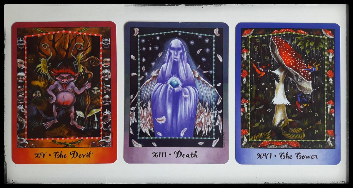 Katie Posted July 2, 2019 Posted July 2, 2019 (edited) Interesting that more than me rejects a deck and then likes it 🙂 So.. I read in the book "Holistic Tarot" that contemplating on Devil, Tower and Death is somethong one should do. So...I did. I think the Death card is really spoky. Reminds me of that sheet of fabric they put on corpses faces/body. Remember when I was a kid in the 80s and there was on the news about a piece of fabric i Turin, Italy, that was maybe from Jesus face. But they found out it was not, I think. To have that mushroom as the tower is clever cause it is both beautiful and poisonous. Edited July 2, 2019 by Katie