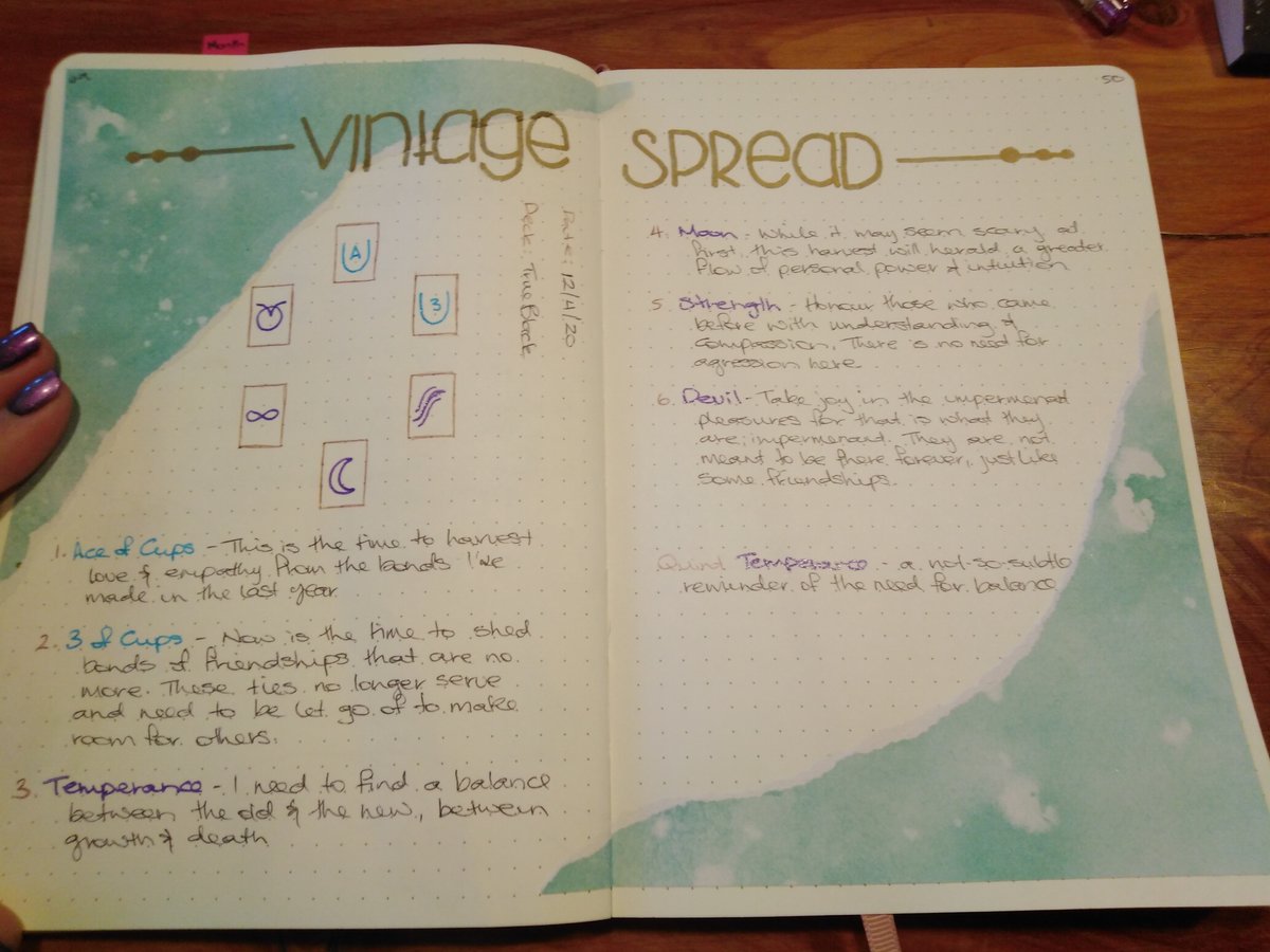 LogicalHue Posted July 23, 2020 Posted July 23, 2020 @TheFeelLion Well my Journal journal isn't very visually interesting but I do some journaling about my past week and where I'm at at that moment and if I think of something specific to do a reading about. Then I write the name of the deck I'm using and draw 3 little boxes (more if I end up drawing more cards) and label which cards I drew. I use the space around the cards to write down observations about the relative visuals on the cards. Then I journal some more. I've put my readings from the above process in my BuJo 3 times, and they've all looked a little different as I learn but here's the latest: The top is the number, then a color for the suit, then the title of the card where applicable and then if it was reversed, and maybe if I ignored that it was reversed. After that is an explanation of what's on the card, and the lower (empty in this photo) part is for a sum-up blurb of what its telling me. I had a hard time with this step on that one. I took a guess and filled it in and then immediately regretted it and ended up making a note to that effect.