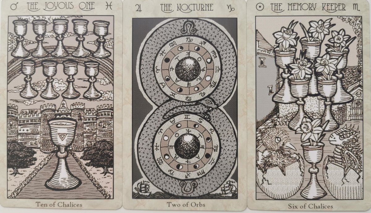 YlvaBlue Posted July 15, 2019 Posted July 15, 2019 (edited) Tarot forecast for the week: The Joyous One - 10 Chalices The Nocturne - 2 Orbs The Memory Keeper - 6 Chalices When I was shuffling, the 10 of Chalices slipped out. I don't normally take note of fall-outs, but when the same card appears in the spread, I reckon it's worth making a note of it! (I love, love, love the 6 Chalices! Look at how cute the little baby phoenix and the little baby dragon is! 😍) I did a first intuitive read, and wrote this: Time is my ally. Now I stand with a world of possibilities in front of me. It's joyful: these are dreams I can bring to fruition. Day follows night follows day - and those dreams flower. I'm back to childhood enthusiasm and anticipation about what will happen next. Then I put together the hexagram and interpreted it using the Book of Maps. Wind + Wind = Sun: Use Gentle Force. The wind is powerful because time is its power. Be like the wind - use time to accomplish and endeavour. Looks like my intuitive read tapped into the cards pretty well 🙂 For context: This is my last week at a place I've worked at for the last ten years. It's a big old Victorian school and looks suspiciously like the castle in the background of the card. I'm feeling very fond and grateful for all that's happened since I started there...but I'm ready to move on. Last week I felt like there was a missing piece which was stopping me from being able to set my plans in motion for this, the next stage of my life. This week, that missing piece turns up. It's not a thing, or a person, or an event. It's a feeling. That squirmy, excited, can't-wait-for-tomorrow feeling I used to get as a kid which stopped me sleeping the night before something I was really looking forward to happened. Well, here it is. (BTW, this is the end of a process that began with the 30 days of the Moon spread back in the Spring. Looks like it was even more transforming than I thought at the time!) Edited July 15, 2019 by YlvaBlue
