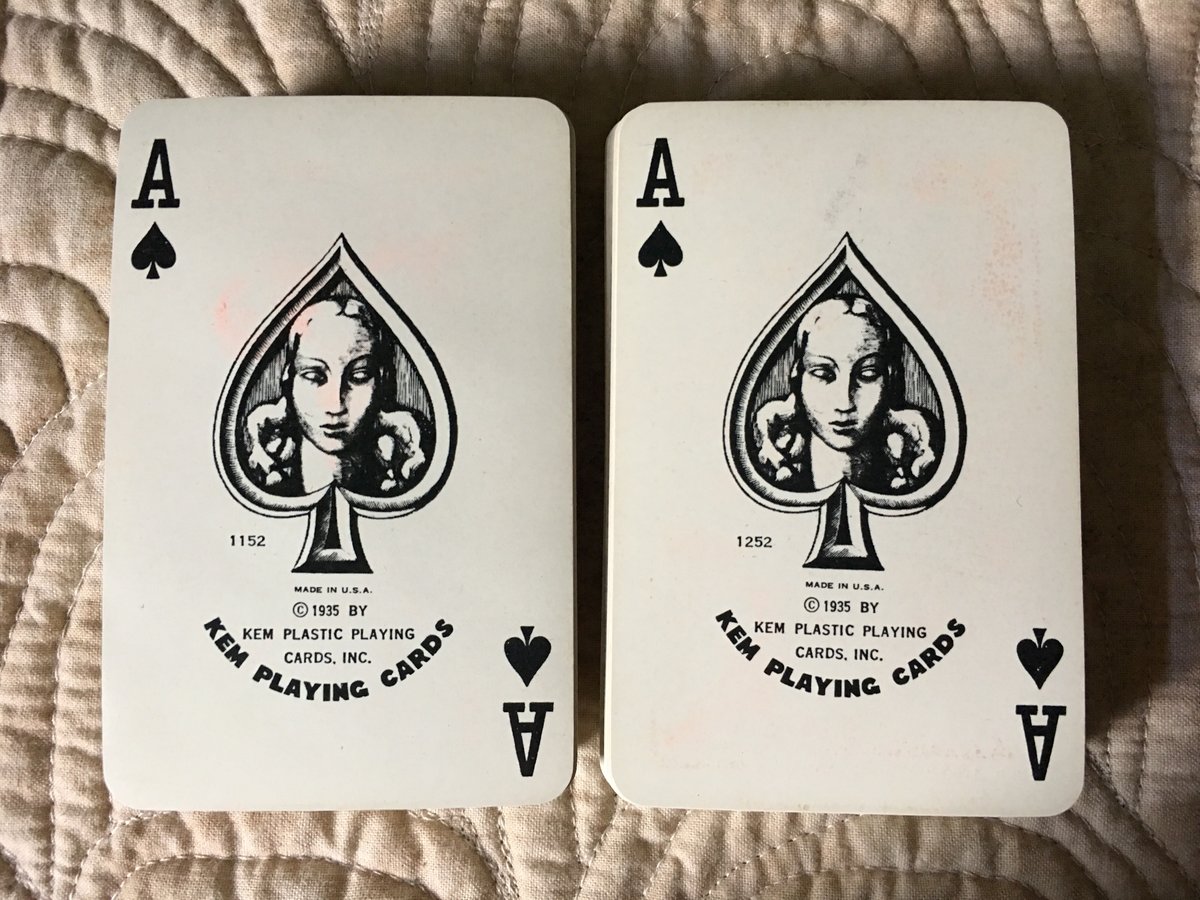 Madame Squee Posted July 25, 2019 Posted July 25, 2019 (edited) Is it Show & Tell Friday? I also have some wonderful old KEM plastic playing cards from the 50's. They also shuffle like butter and read very well too. The Aces tell you when the deck was printed -- just look for the four-digit code. One of these decks was printed in November of 1952, the other in December. Both decks are well-used and have turned an ivory color, except for the Jokers and re-order cards, which have remained stark white. Pinkish and green marks appear on all the cards, I imagine as a consequence of color bleed and absorption over the years. The two decks are stored in their original bakelite box, which has that old lovely (depending on your perspective) bakelite aroma. I found them on eBay. Now, I've wound myself up and will have to sign up with playing cards next week. Edited July 25, 2019 by Madame Squee Add photos!!!