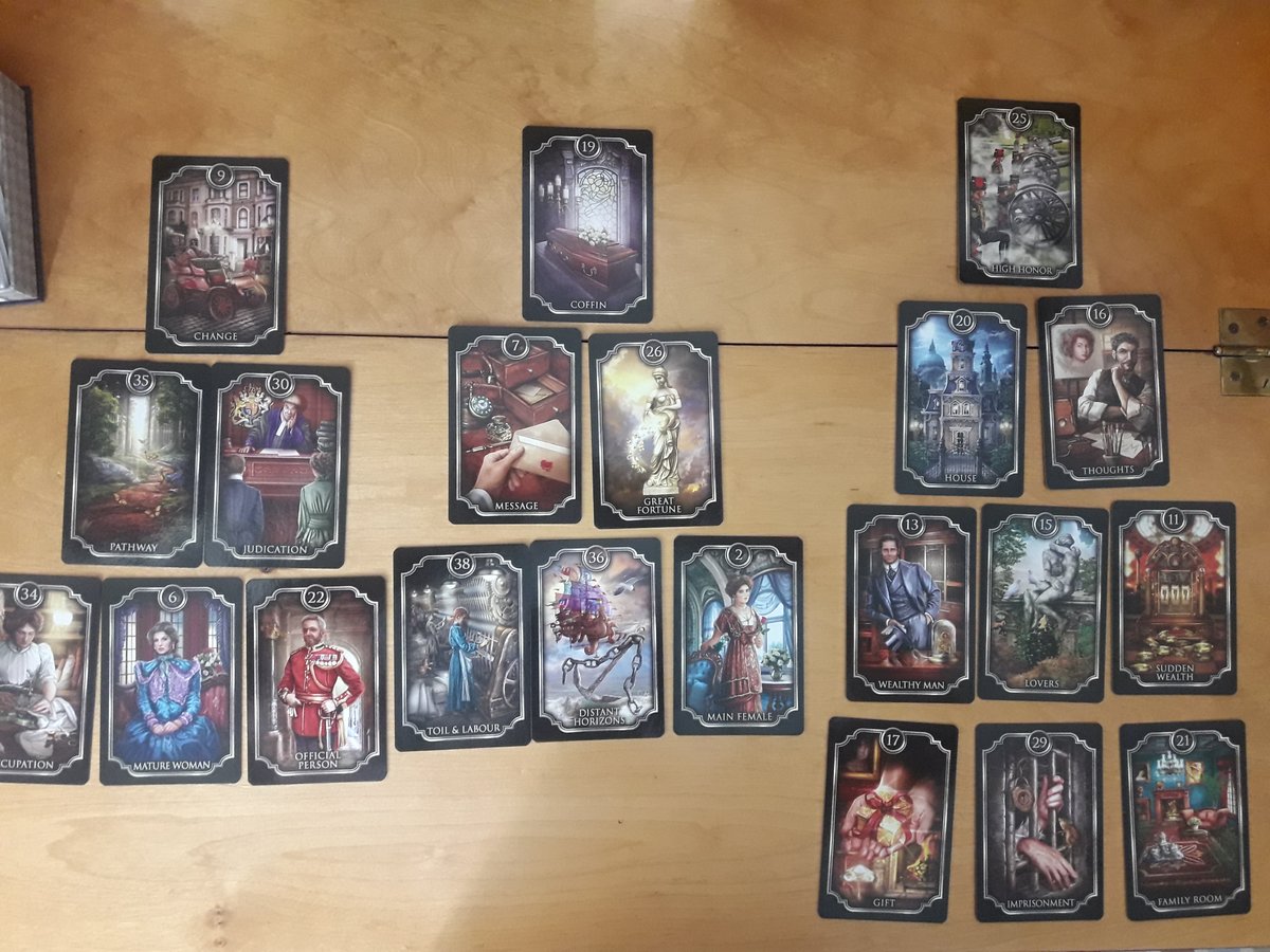 Katie Posted July 20, 2019 Posted July 20, 2019 I'n in! Fin dr Siècle Kipper fortune telling deck. Asked them about what to do with all THINGS I have. I have been tumbling this question for years. I keep sorting things and keep things that I use. Somehow I keep ending up with full cupboards etc. What to do with these material things? Best possible outcome is the pyramid in the middle. The coffin tells me it's time to say goodbye to many of the things. Great fortune spills on the significatpr (nr 2 card). Obstacles (left pyramid) is that there is a constant change/flow of things. Both mine and the family's. The outcome pyramid to the right is mainly positive. Surprise cards are positive though imprisonment spills a bit on the family room card. So... keep on sorting stuff out but maybe being more tough on it. Katie
