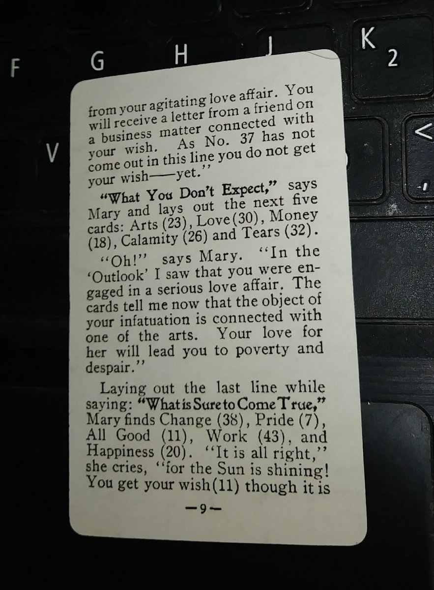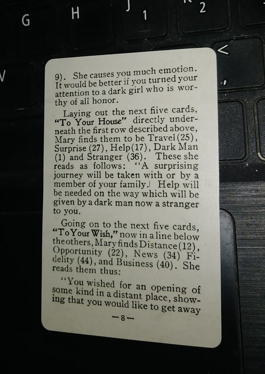 katrinka Posted December 3, 2019 Author Posted December 3, 2019 These? It's just a sample reading, filler, really. But I totally get the need to see the full instructions. It just feels wrong not to! (Pardon the angle, I didn't want the flash making it illegible.)