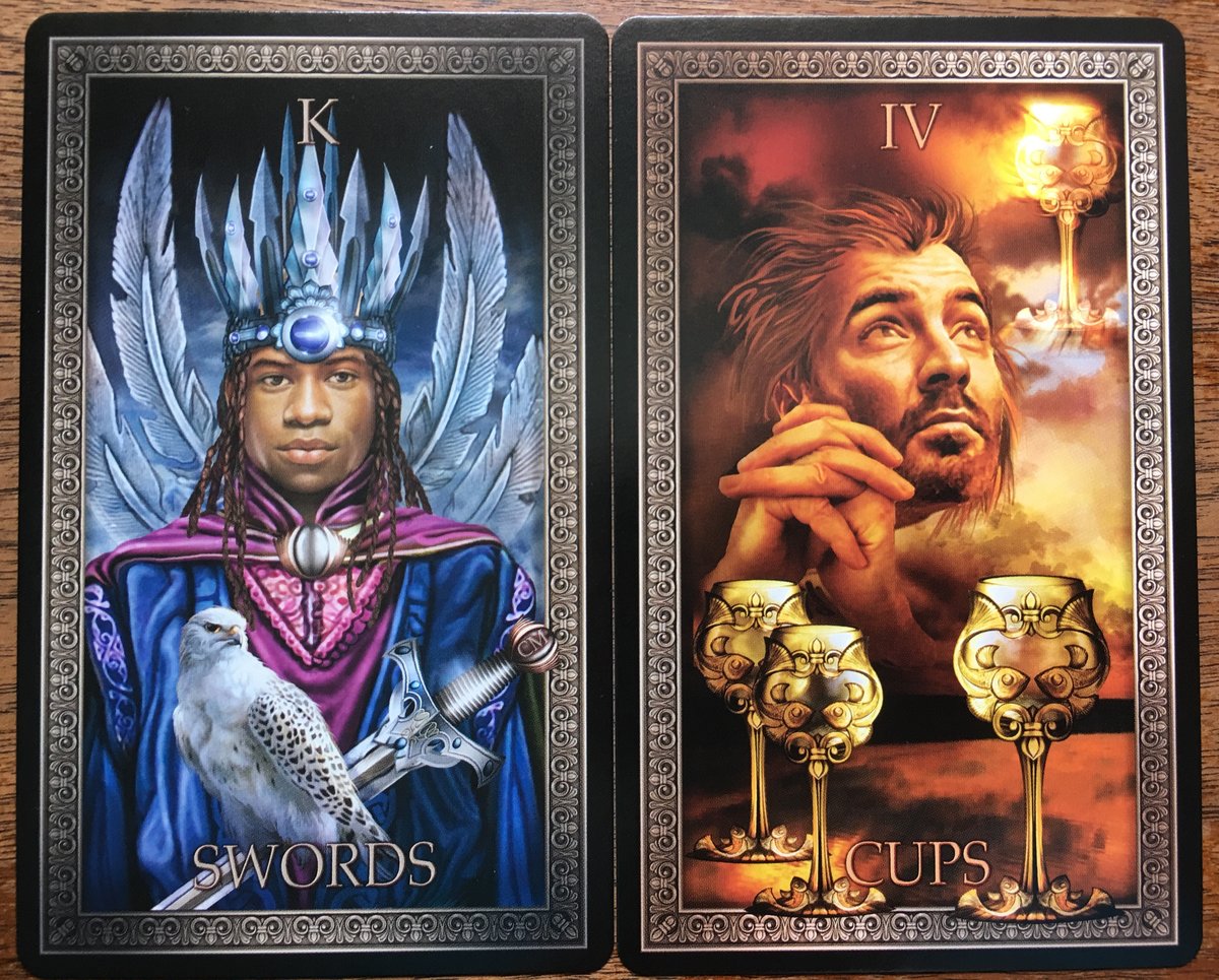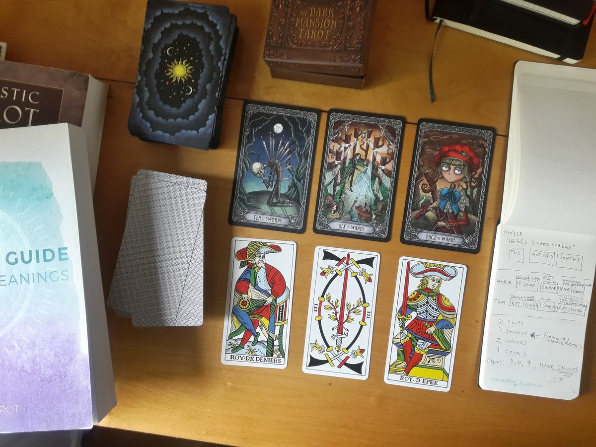 Katie Posted July 28, 2019 Posted July 28, 2019 (edited) I am very happy working with these decks. I started with Tarot when I was 13-14 ys old and could only afford the cheapest deck then which was Crowleys Thooth. A couple of years later I couöd afford the Mythic Tarot which sort of killed my interest. Last year I took up the interest again an bought some decks that weren't too simple read either. I have spent last 4 weeks on reading a lot on Tarot and it sort of pays off. The Dark M tarot is so easy to read. I finally admitt that RWS type of system is good for beginners. I enjoy the process of preparing to do a spread. Collecting energy and focusing until it's time to do it. Today I chose to do a "Hegel" spread; thesis-antithesis-synthesis. I read that 3-cards spreads are a nod to Hegel so why not use his terminology explicitly and name it after him? Second row is the same spread repeated. I don't see that row as a clarification but more as a anchor (I use the CBD TdM because is the afore generation deck system compared to RWS) to the modern RWS Dark Mansion Tarot. I find this spread very meningful to me. At the second row: king of coin....is equipped by 3swords and transforms to king of sword. Amazing how well this set up work for me. Oh, I have to add that the CBD TdM cards are so nice to shuffle and hold. Their width is perfect for my hands, and I have normal-large hand size. Katie Edited July 28, 2019 by Katie