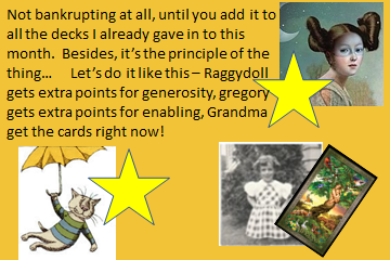 Grandma Posted July 31, 2019 Author Posted July 31, 2019 Oh my goodness they are both gorgeous, but gregory's is the one I was looking for Several interesting questions spring to mind: 1) Raggydoll responded first but did not give the right answer, so does she get the extra points? I wasn't specific in my offer and now I'm confused... 2) Why did I not easily find this card myself? Perhaps my lack of a good night's sleep caused a short circuit in my Googling ability. 3) Does gregory get extra points for doing it before herself? The concept of time is fascinating. If one views it linearly, then I would have to say no. If it's more of a spiral, then sure, why not! 4) You are both amazing - thank you! How was I lucky enough to find this tarot home and make these tarot friends? 5) My tarot budget for the month has long since been exceeded. Should I wait until tomorrow to begin tapping into next month's allocated funds, or just order the deck now! I've never been too good at delayed gratification, but surely I can hold out until midnight... Love, Grandma