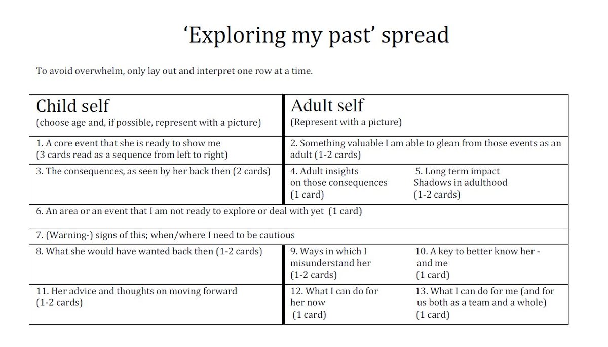 Raggydoll Posted August 2, 2019 Posted August 2, 2019 9 hours ago, Grandma said: Excellent point. I would never read for another person this way. It would not be safe or constructive because I'm not qualified to address problematic issues that might arise. Any repressed memories delved into (I wrote "suppressed" in my first comment but I meant "repressed') would be only my own and I have a therapist whose mother was a tarot reader to help me with any resulting trauma. (I just Googled "tarot and psychological therapy" and some interesting-looking articles popped up. After I read them I might start a thread on the subject.) But I like your ideas, @Raggydoll. Do you have any thoughts about spreads? I did one last week which was an adaptation of my signature spread. I asked 1) what was going on at home when I was a preschooler, 2) what did I already know about the answer to card 1, 3) what did I next learn about it, 4) how did this affect my inner experience at the time, and 5) how did it affect my place in the world at the time? The result was enlightening. Since the thread starter so kindly gave us the blessing to discuss this further, I took the liberty to sit down and start sketching on some ideas for a spread. Just be mindful of the fact that I brainstormed this prior to my cup of morning coffee, and that all those disclaimers we spoke of earlier needs to be taken into consideration ☺️. And of course - only take what resonates and ignore the rest! Basically, there are two main columns and then you go one row at the time. On a couple of occasions I separated the adult column into two sections, to explore dynamics and pinpoint contrasts. You'll get the idea once you've read through it all (I hope!). There are lots and lots of cards in this so feel free to improve, modify and shrink it down in any way you like. I promise I won't mind.