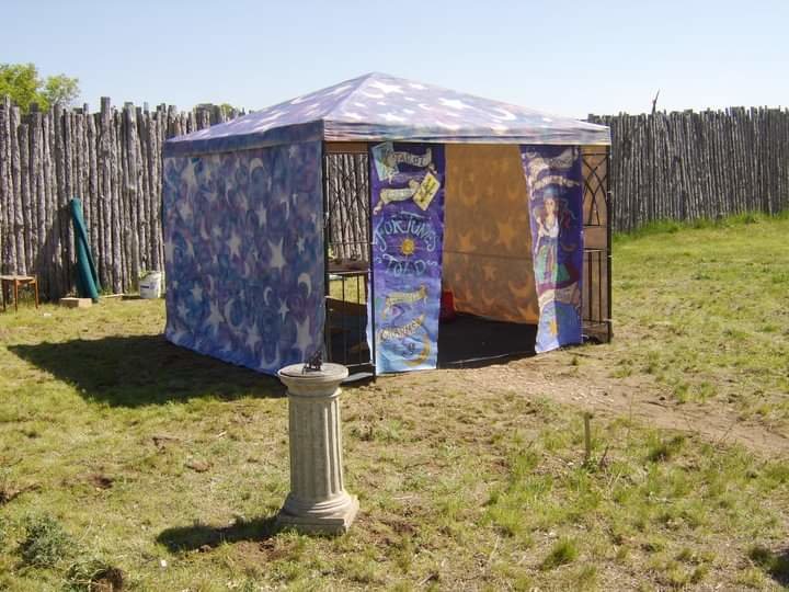 HOLMES Posted August 12, 2019 Posted August 12, 2019 (edited) https://www.thetarotforum.com/forums/topic/7659-asking-for-light-prayers-and-good-thought-for-pow-wow-readings-2019/?do=findComment&comment=113456 this brings you to the photo.. the banner is 6 feet length 2.5 feet height. in retrospect I should of made it may 1.5 feet. eheh the banner cost me 120 Canadian and took abut 2 weeks to make . the canopy is just your 88 dollar canopy/gazebo you buy at Walmart. I brought an extra sunwall coeman off amazon for event. first time using it.. the next day we took off the string on the side,, tighten it up at the top,, so people walked around the sign on other side. the tarot cards were just stock tarot images the printers had,, when they sent me the proof,,i asked for a different card on the left, and to make holmes HOLMES. the round table is one they got at Canadian tire,, it been about 6 years now. the red table cloth is just table cloth we got at Walmart. the stand alone sign I paid about 110 dollars ,, years ago,, it is double sided with the side you can't see is black with yellow writing and some cards.. I switch it back and forth ,, day light, dark,, night time light side that you see there. the reason you see all the chairs around me is,, I have a close but big family,, and I don't drive so my mom has driven me to all my events since we started.. so when they were younger they would go to listen to music at the fair,, and at the pow wow,,but since my mom is now handicapped,, they just sit at the side the last couple of years. I don't have any thing on the table besides my cards.. one time I brought a brunch of books,,and for some reason that was the year I did horrible. plus it is a inconvience. for you depending on your independence, ,funds, time constraint you could fine these idea.. I got the sign after I saw someone post their set up at the tarot nerds, and in them they had a big yellow banner across the top, and a sign hanging from their table. (friends told me to get a hanging sign for a year and half at event). I saw a person use a trailer for their set up. they drive it up.. and then read from there. if you see the cinder block at the bottom. , we always have trouble with the wind attempting to blow away the gazebo.. so last fall we had cinder blocks which we put over the bottom and we tie the gazebo to. Edited August 12, 2019 by HOLMES