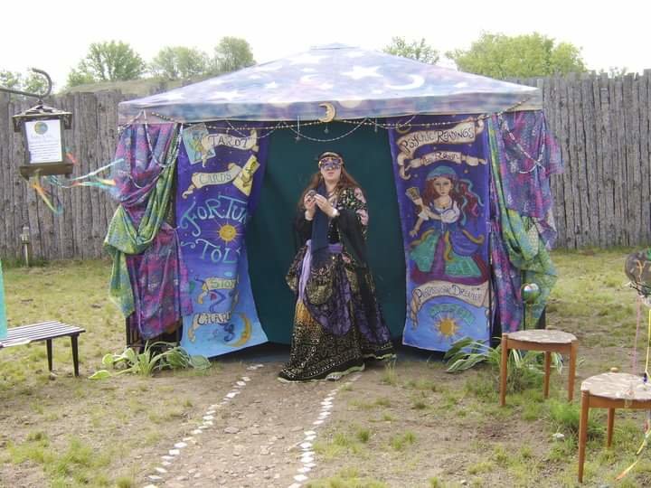 Mi-Shell Posted August 16, 2019 Posted August 16, 2019 When I used to do all the fairs I had a white show tent with the side walls, decorated it with several large shawls/ with sun and moon artwork on it and a sign outside with the name of my business. I also had several cork boards with information about me and how I do readings, testimonials, prices etc. Then inside I had 1 decorated table set up with different decks I use and some books about Tarot and a few illustrated spreads I offer and of course a line -up sheet with time slots , where people can sign in to get in line. When one of my students was with me, she would be there do 1 card oracle readings for the people that are signed up and waiting and also keep the flow smooth and supply me with nibbles and something to drink, to keep my throat happy... Toooooo much talking, you know..... Sometimes, here in Bracebridge at the fairs We had our JShow tents with our hand crafted jewellery set up with my husband selling there and me- away from all the noise and activity under a shady Tree with my reading table. Pics of my reading tent are on my oooooold dead pooooter, but here is one form me under the trees. Clients usually are not shown, unless they are popular public figures like our Mayors or the Minister of Indian and Northern Affairs or so....