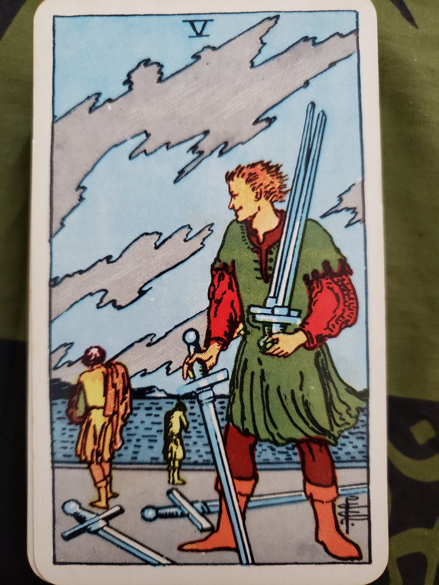 katrinka Posted August 18, 2019 Posted August 18, 2019 2 hours ago, Eric said: I do like to say the main figure in the 5 of Swords over came the odds against him and won. The two walking away were overconfident thinking they could take him on and win. Thats what his smirk is all about. That's not what the image was intended to convey. http://www.sacred-texts.com/tarot/pkt/pktsw05.htm