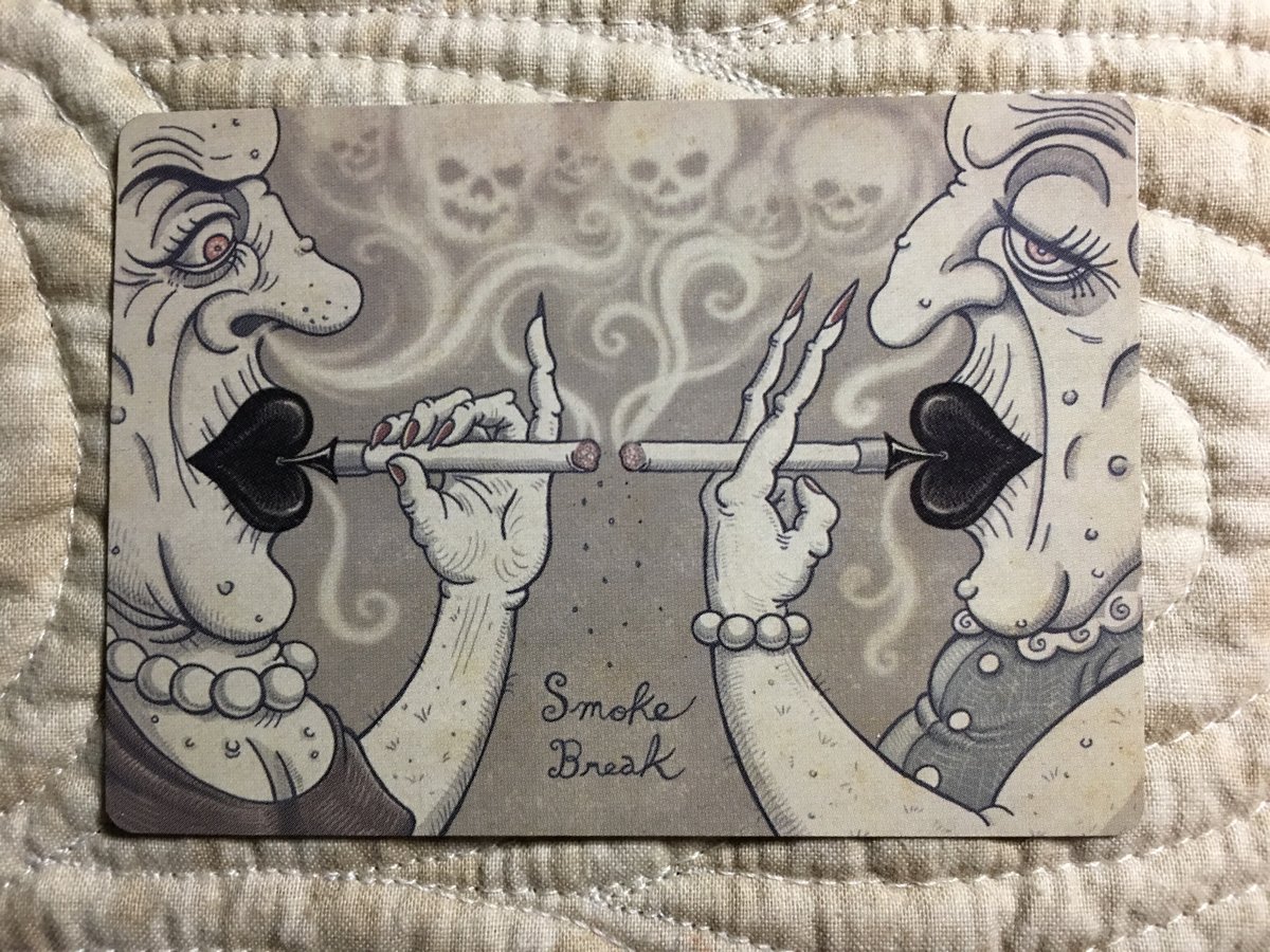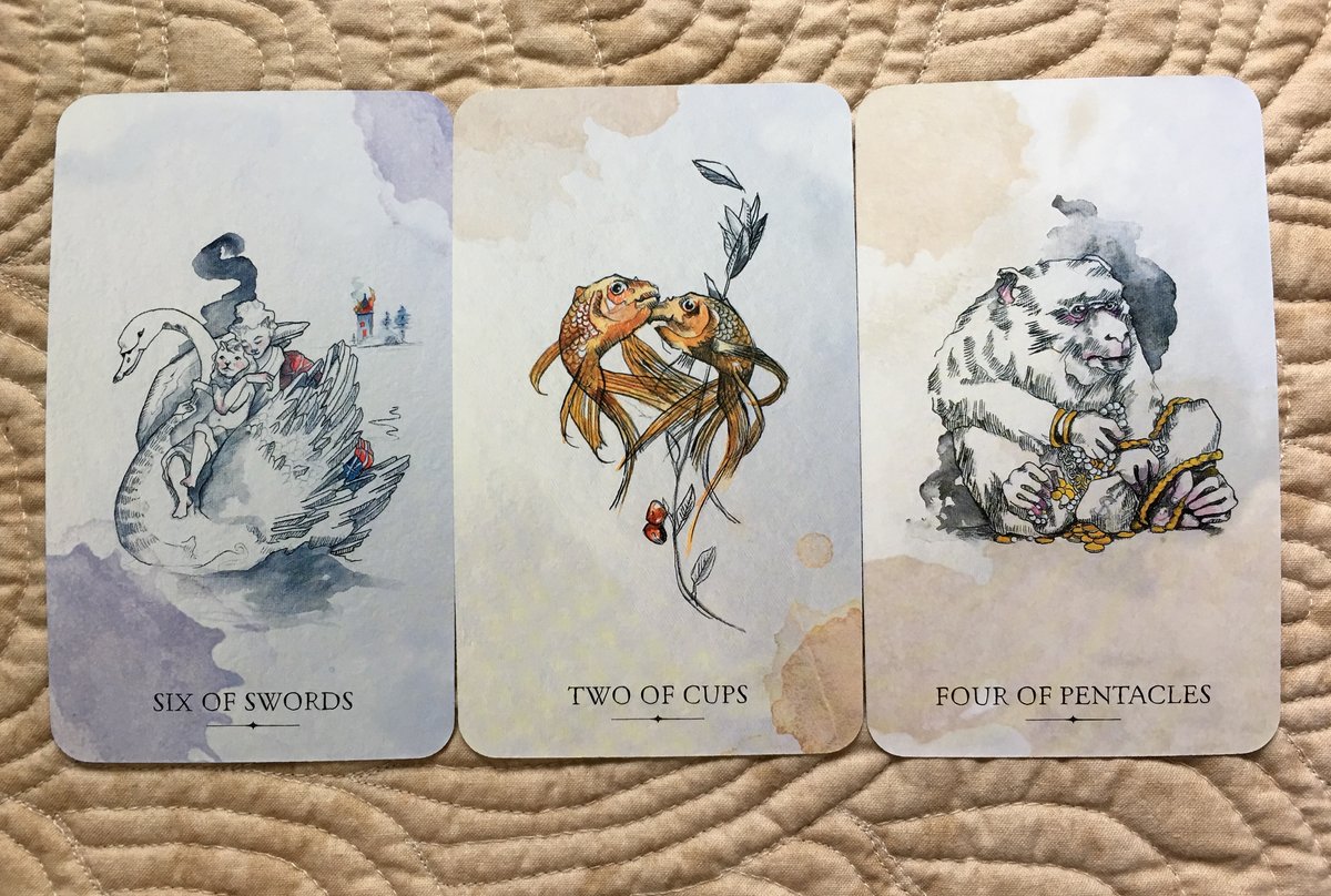 Madame Squee Posted August 30, 2019 Posted August 30, 2019 Last night, I laid out a practice reading for an imaginary querent. She's a few months into a romantic relationship and wanted to know where it's headed. Three cards were drawn: Six of Swords ~ Two of Cups ~ Four of Pentacles Unfortunately, this spread alarmed me. I see a conflict: the end cards are pulling in opposite directions away from the central, forward-facing card. In my interpretation, the Two of Cups represents the relationship. The Six of Swords and Four of Pentacles each represent a partner in the relationship. On one hand, I see someone who is seeking respite from the partnership, and on the other, a partner who is turned towards self, not focused on sharing or contributing to the success of the partnership. The Six of Swords shows a cat and her kitten, safe and content in each other's arms, sailing aboard a large swan. A turret burns on the distant shore behind them. The Four of Pentacles shows a small ape sitting on the floor, holding onto jewelry, treasure and bags of coins with all four paws. This simian's countenance reveals nothing of affection or camaraderie. What's conveyed is more like suspicion. My instant reaction to this spread is that a split is inevitable and probably for the best. Studying it doesn't reveal much else to me, except that the even numbers on both sides make them feel stuck in their trajectory. Wanting to test my interpretation and anxious to try out my new Royal Mischief Transformation Playing Cards to see if I can make them work, I drew one card and turned up the 2 of Spades, entitled "Smoke Break". Well, this feels like validation. The querent and her partner really aren't good for one another. They appear to be reinforcing each other's problematic behaviors. It also occurs to me that if one partner rejects this mode of interaction, the partnership definitely runs into trouble. (In the playing-card system I use most often, the 2 of Spades stands for "The Enemies".) Finally, it seems to me that the partner who is contemplating flight in the Six of Swords is the only one who can make such a decision, because the person represented in the Four of Pentacles wouldn't. In fact, I almost worry about the possessiveness evident in the Four of Pentacles playing out in a negative way should the relationship actually break up. This morning, I felt so bad about this gloomy reading, I turned to the Otherkin companion book to see how far off course I've wandered. Apparently, I haven't. Not at all.