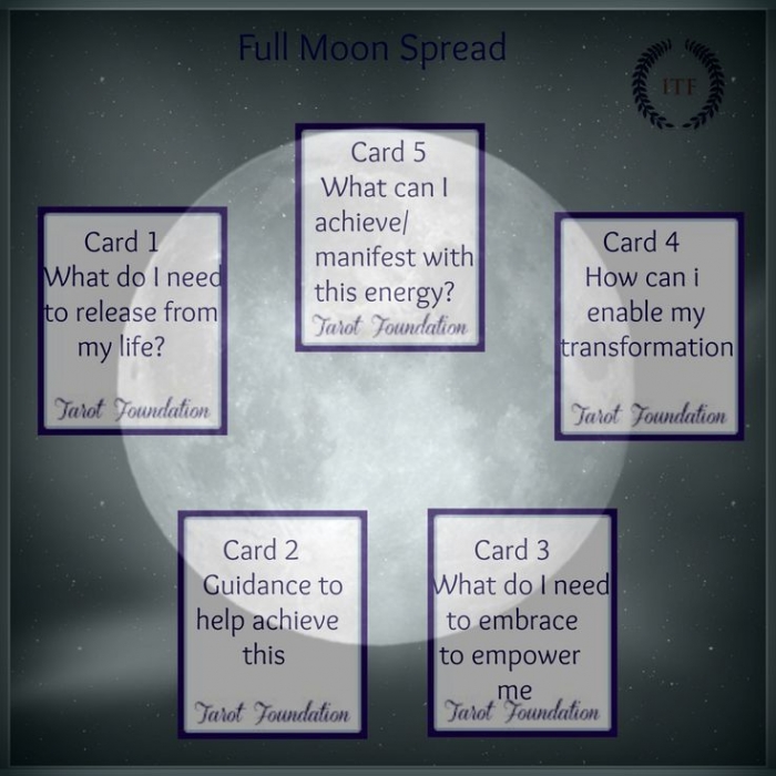 RavenOfSummer Posted October 5, 2017 Posted October 5, 2017 I came across this Full Moon Spread by the ITF. I really like this one so wanted to share here. Usually I tend to work with my Spirit de la Lune oracle for the Full Moon, which has a spread for each full moon throughout the year in the accompanying book. But I like this spread that can be used at any full moon. 5 cards, laid out in a circle. Picture is attached. Card 1: What do I need to release from my life? Card 2: Guidance to help achieve this Card 3: What do I need to embrace to empower me Card 4: How can I enable my transformation Card 5: What can I achieve/manifest with this energy?