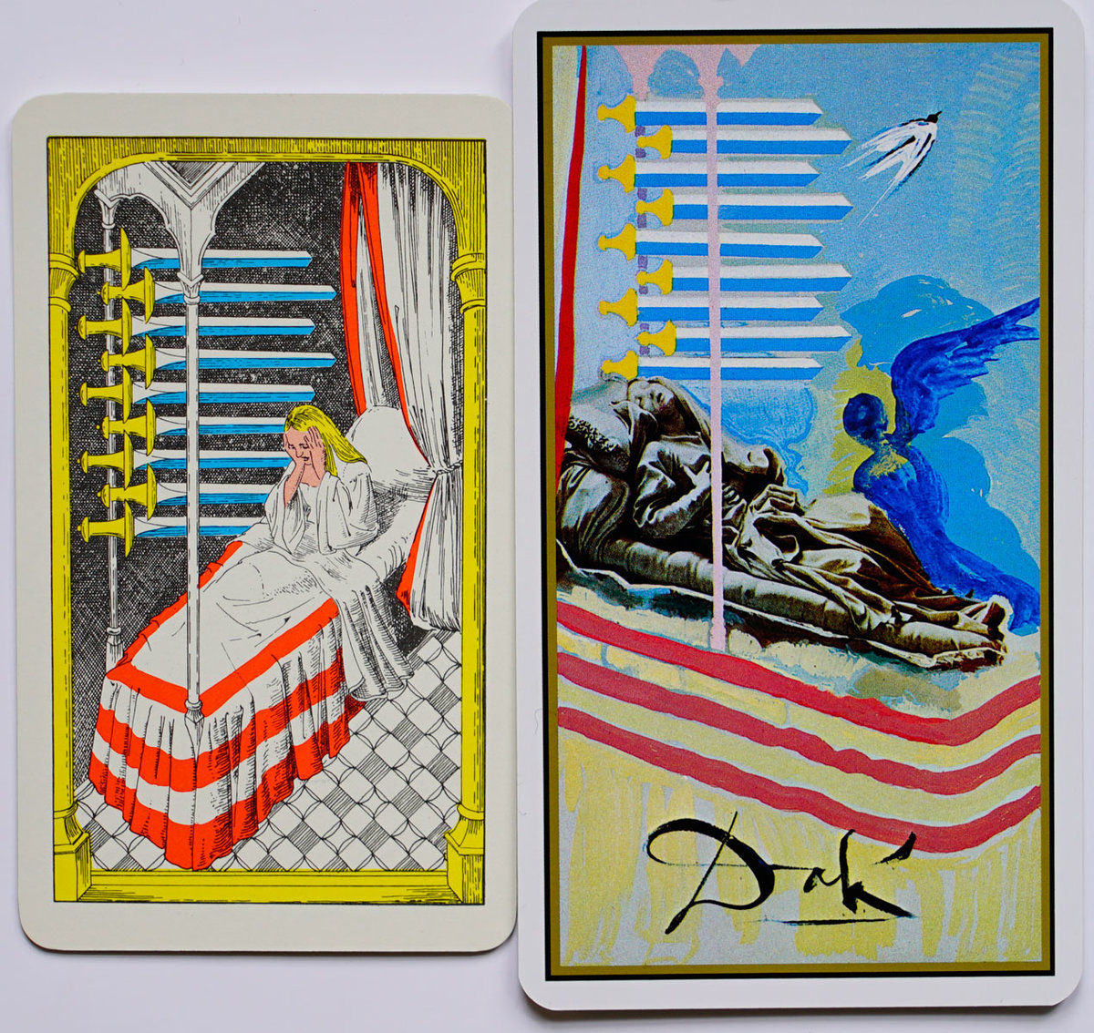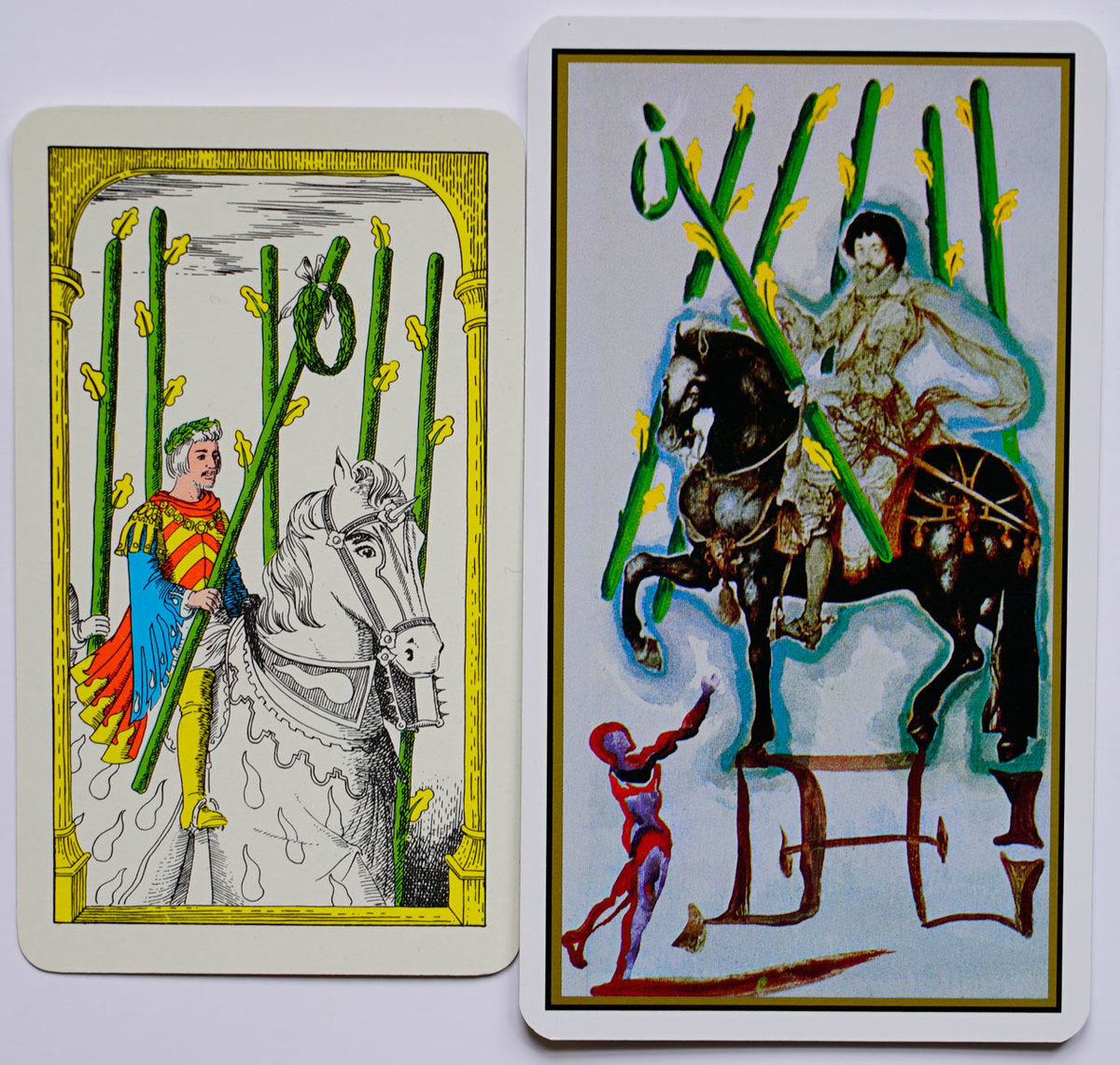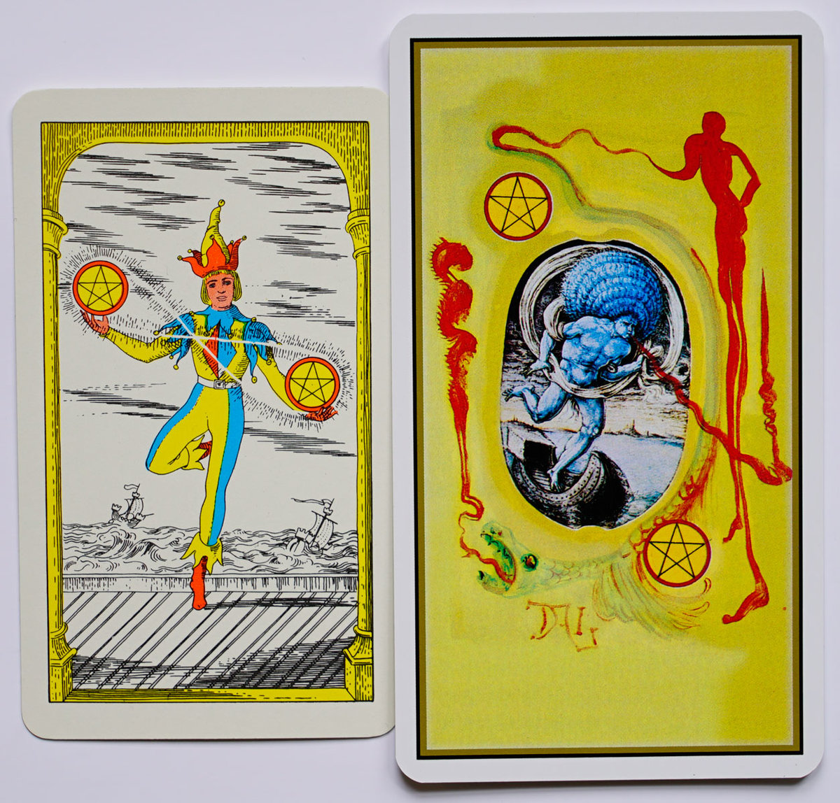 iofthebeholder Posted December 1, 2019 Author Posted December 1, 2019 (edited) as previously mentioned another thing i certainly noticed about this deck: Dali obviously "drew inspiration" in a very direct way from the Royal Fez Moroccan deck. the RFM was evidently first published in a limited run of 500 in 1970, later republished in a non-limited US Games edition in 1975. info on the Dali tarot says only that he worked on the project in "the 70s", not finally published until 1982. examining many cards from each deck side by side clearly shows Dali (or whoever might have assisted with the minors) used the RFM as a primary reference creating his imagery, even down to specific details. if another person did assist with the minors it seems clear Dali still had a primary role insofar as the brushwork, the prominent integration of his variable signature as a major component in each composition, and the addition of hand painted primitive figures over collaged elements. Edited December 1, 2019 by iofthebeholder