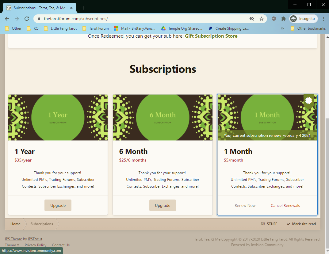So you don't get the following buttons under the month, right?  https://www.thetarotforum.com/subscriptions/
