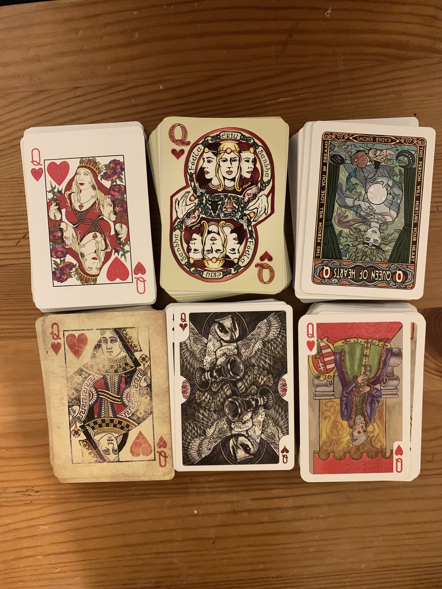 Flaxen Posted December 11, 2019 Posted December 11, 2019 Those faces are very expressive! I have a few different playing card decks. My workhorse is the Bicycle Series 1800 - I love the aged look. Top row from left to right: Charta Bellica, Strigiformes and 1800 Bottom row left to right: Kadar Fortune Cards, Celtic Myth and Whiteknuckle.