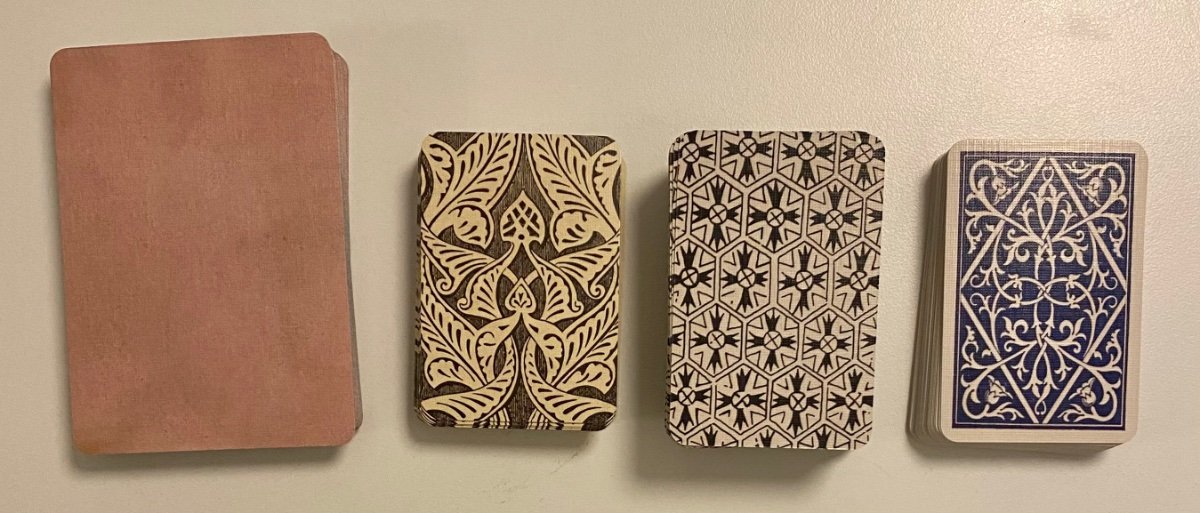 Raggydoll Posted January 6, 2024 Author Posted January 6, 2024 7 hours ago, Scandinavianhermit said: Any deck following the standard Swedish pattern will do: https://www.wopc.co.uk/sweden/standard-swedish-pattern In order to allow large square spreads, Piatnik's solitaire deck for reasons of cards size: https://www.piatnik.com/en/games/playing-cards/patience/rose-i I’ve begun printing my own decks in mini size to allow for big spreads. I really like the smaller sizes too! For comparison, some of my self printed decks Standard poker size to the left, the rest are ‘European mini’ size. From left to right in mini size : 40 card deck, 78 card deck, 52 card deck