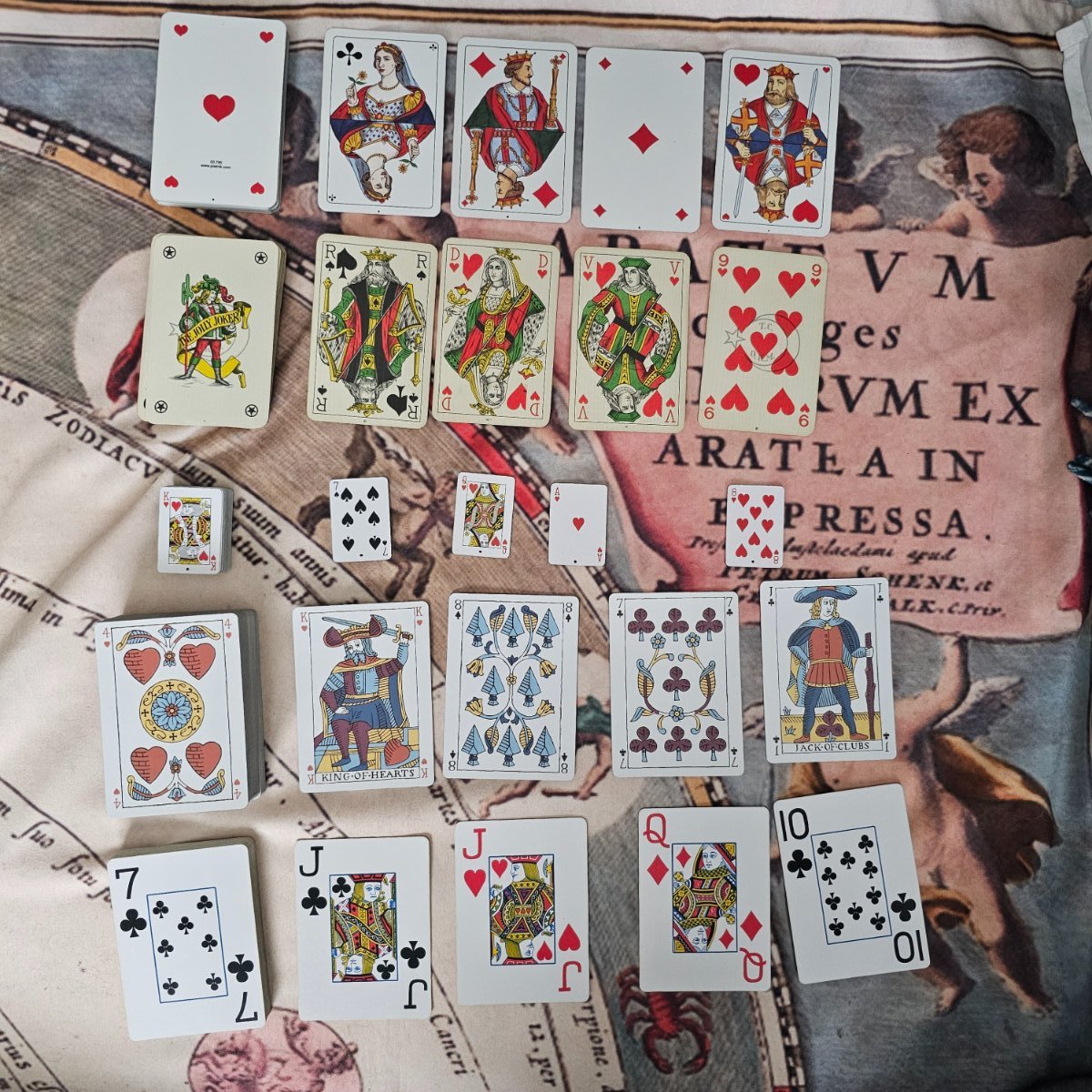 akiva Posted January 6, 2024 Posted January 6, 2024 (edited) 38 minutes ago, Eugenie said: Yes, imagine! Well, I am not really heart broken because I don't do pip decks yet, and in any case I will need to start with something very basic. But the deck is lovely, charming, fascinating! For a long time it was my working deck, I even had a lovely chat with the creator about the symbolism in certain cards. Mainly his rendition of the Hangedman, as it looks so much like depictions of Nasreddin riding a donkey backwards 😆 it certainly is a charming deck. 38 minutes ago, Eugenie said: I am sorry I have written so many off topic posts here! On the topic, maybe I will buy me a vintage deck tomorrow, if it is not a 36 card one. Do they sell many 36 card ones where you are? In the UK it's hard to source them, I have a whole bag filled with cast off 2-6 pip cards (I tend to read with 32 card decks) it's so much easier finding decks that you don't have to remove cards from! Just remembered another favourite of mine, the bicycle stargazer deck: This gets used for the polish 24 card method more than anything else 😁 Not sure if it counts, but I also sometimes read with Napoletane cards. They're Italian playing cards (that vary greatly region to region) used for playing games like Scopa, which is quite fun! The decks are reduced down to 40 cards 1-7 + lady + knight + king. They tend to use Sticks, Cups, Swords and Coins in place of the French suits. Though the Tuscany deck uses French suits and they're much prettier than a standard deck of cards: This is an antique Tuscany deck selling for £398 on abebooks 😱 Here's the Napoletane cards I own: Much cheaper and affordable 😆 Edited January 6, 2024 by akiva
