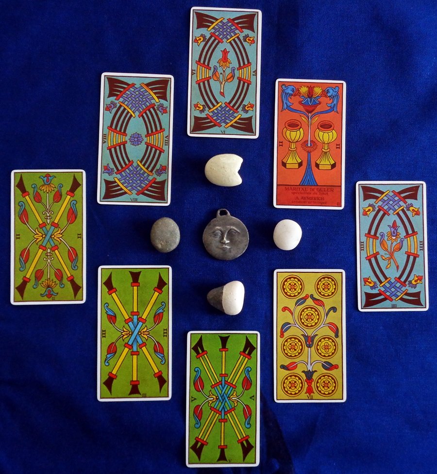 Barleywine Posted March 4, 2020 Posted March 4, 2020 (edited) Every month on the New Moon, I try (but often forget) to do a Lunar Month Look-ahead reading, using some "lunar phase" tokens as the centerpiece. I've started using only the minor cards for this because they are more representative of the kind of daily routines the Moon symbolizes. I used astrologer Dane Rudhyar's eight-phase Lunation Cycle as the model. Each pair of cards spans a roughly 3.5-day period from beginning to end. Here's what it looks like: Edited March 4, 2020 by Barleywine
