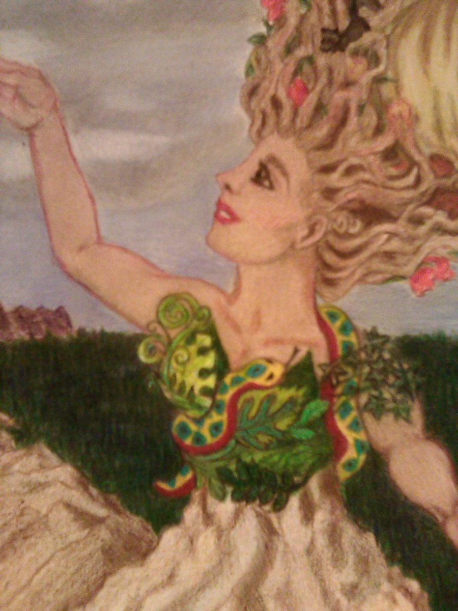 geoxena Posted February 9, 2020 Posted February 9, 2020 (edited) Thank you. I'm feeling better about it. Had considered starting all over again, but decided instead to keep working on the parts of the drawing that I like, and I figure a solution for the issues I'm struggling with will show itself. So, I added a stormy sky and it looks pretty good - gives some definite drama to the piece - and finished the bird, which came out so cute. Then I had to work on my Nurturer's skin tone. I had mixed an oil-based pencil in with the wax-based ones I mostly use because I couldn't find the one I really needed. Well it's normally fine to mix different kinds of pencils, but in this case the color wasn't right and it just looked muddy and sort of messed her up. So tonight I fixed it and am very happy with her now. Tomorrow I work on her vines-and-branches hairdo! Edited February 9, 2020 by geoxena