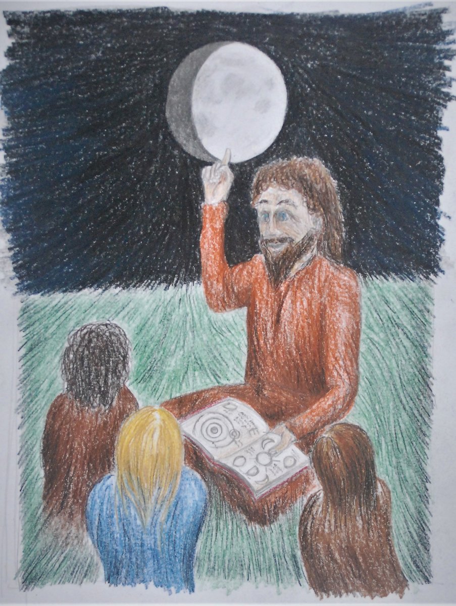 Wanderer Posted March 15, 2020 Posted March 15, 2020 Not quite finished (and a quick photo rather than a scan, which makes bits of it seem rather weak), but thought I might as well try a completely different style for my last one! This is the Nurturer of Air, explaining away the mysteries of the Moon to a group of children... because what he does best is bring clarity and understanding, cutting through mysteries and showing the reality. He's not interested in being a ruler, or going out on adventures; his goal is to help others to see.