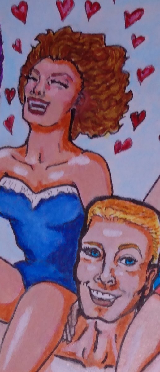 geoxena Posted April 16, 2020 Posted April 16, 2020 (edited) Okay, so I've been delayed in submitting my last cards because the place that scans them for me has limited hours. But it looks like I'll be able to get it done either tomorrow or Friday, thank goodness. In the meantime, I thought I'd upload a li'l sneak preview of the Explorer of Water. My previous cards were done with colored pencil but I used markers for this and did it in a sort of 1950s/1960s comic book style. My Explorer makes me giggle every time I look at it. He's kind of like a muscle beach superhero - he and his friends are having fun in the sun... the woman in the preview is sitting on his shoulder! Of course, she's in love with him! (and, yeah, there's someone else on his other shoulder!) This is just a tiny piece of the whole picture. What do you guys think? Not too irreverent, I hope! [the drawing isn't quite as bright pink as it came out with my new phone's camera] Edited April 16, 2020 by geoxena
