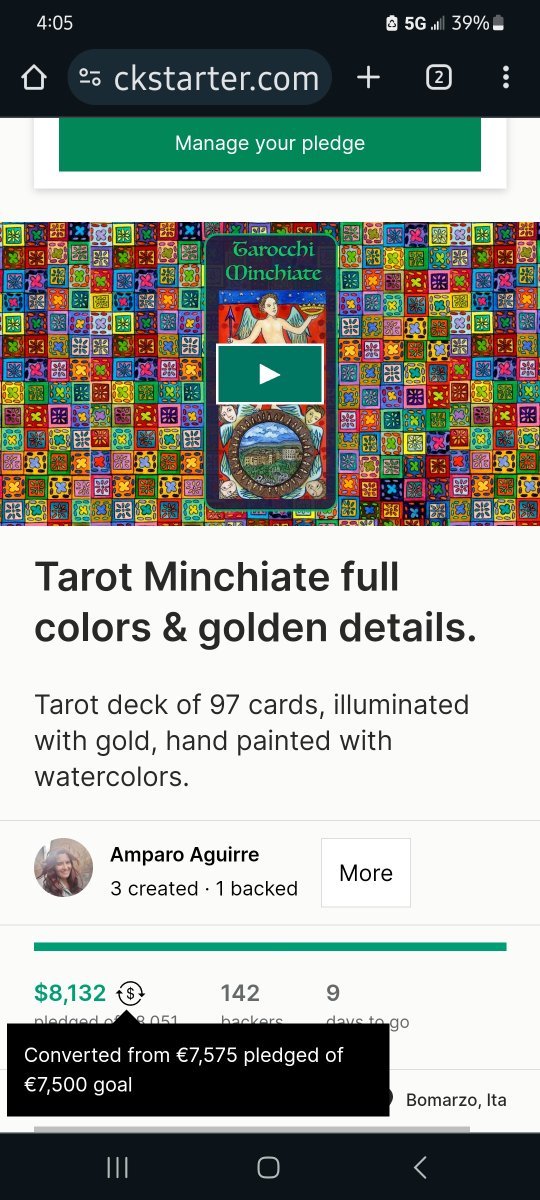 fire cat pickles Posted November 4, 2023 Posted November 4, 2023 On 10/23/2023 at 5:11 PM, DanielJUK said: Tarot Minchiate is back with new simpler Kickstarter - https://www.kickstarter.com/projects/minchiate/tarot-minchiate-full-colors-and-golden-details "Tarot deck of 97 cards, illuminated with gold, hand painted with watercolors" The Early Bird price is going for the next 3 days and the KS deadline is the 14th November With 10 more days to go, this one only needs $35 more to go! My euros conversion is off a little bit, but I think this may be just one more backer...