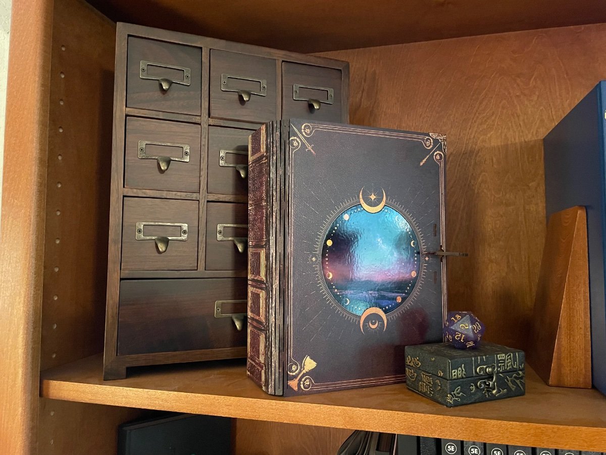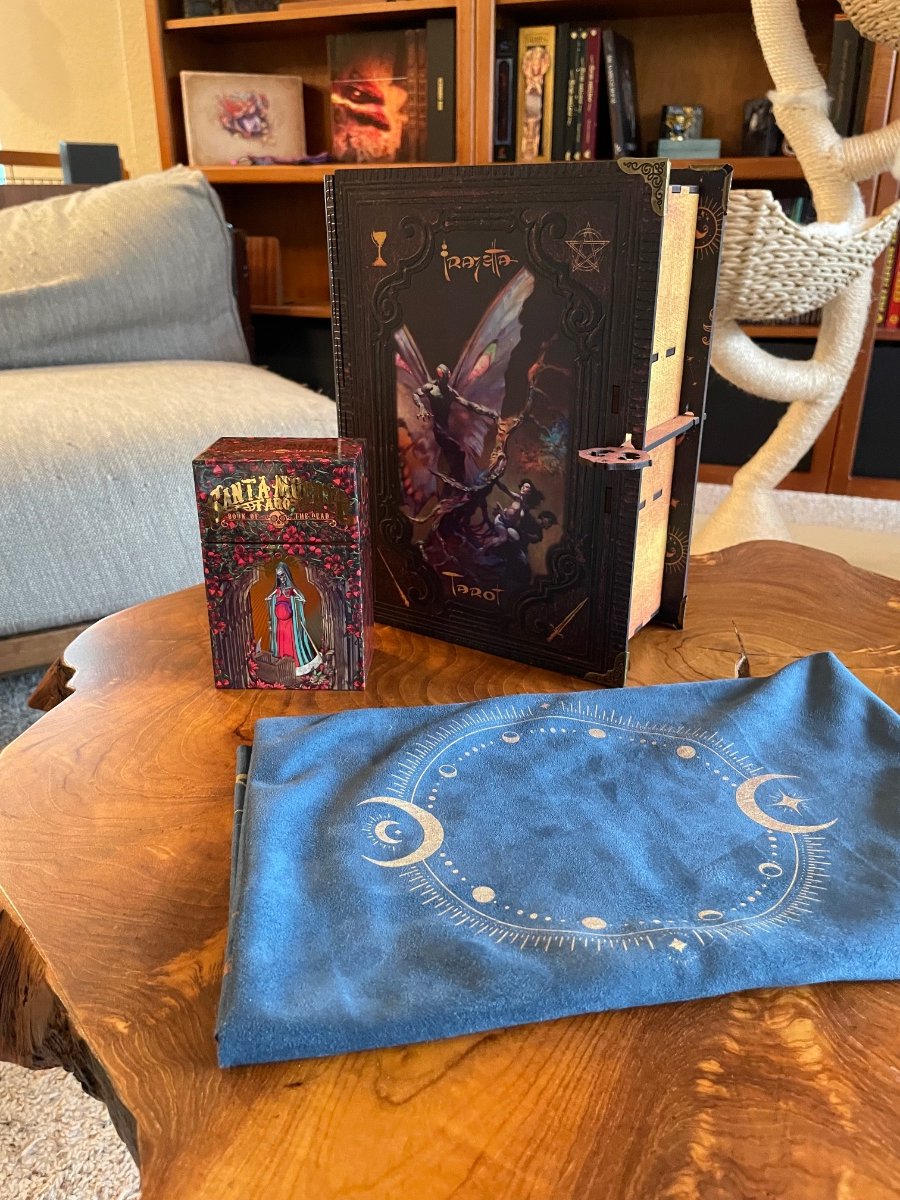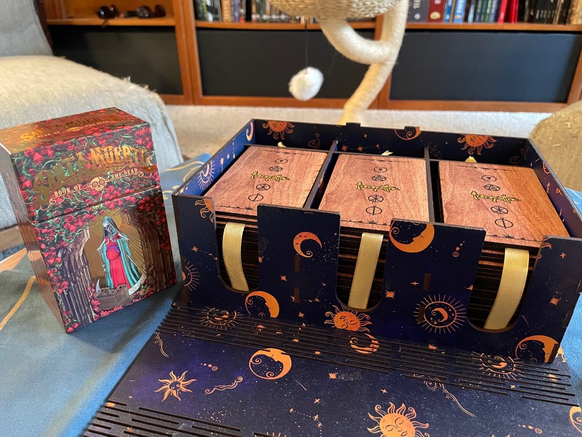 myrrh Posted October 7 Posted October 7 (edited) ...they're standard tarot size cards but that formidable thickness really adds up; these two images next to the santa muerte deck give a good sense of scale... ...i also picked up an additional deck box in the campaign, which is currently providing a cosy home to a couple of nice la muci decks and a few lo scarabeo artist decks: it stacks nicely on my bookshelf... Edited October 7 by myrrh