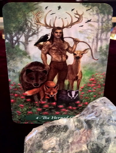 AeonHorus Posted January 22, 2020 Posted January 22, 2020 (edited) 4 ~ The Horned God:~ So the first of the divine Masculine has arrived in all his splendour and glory, donning antlers, a bow and a full on entourage of beasts at his command. He wears the triple spiral tattoo on his right shoulder and bicep which gives rise to the power of three, the maiden, the mother and the crone, this would signify feminine power and especially power through transition and growth. So as masculine as the Horned God is he is still very much so, in tune with his feminine side. Here is Aries the first of the astrological signs, up until now the other four are either planetary or elementally aspected but here we see the birth of pure personality bursting onto the scene like the fires from deep within the earth herself. So let us now take a closer look at those animals he has so near and dear to his heart. Raven represents a keeper of secrets, in fact we see Raven telling the Horned God one of these secrets as he perches upon his shoulder, Badger is strength, Bear stands for primal power, Fox is cunning diplomacy and the Hind would show gracefulness and again femininity. This draws my eyes down to the forest floor which positively blooms with wild bergamot and their radiant red flowers which would denote authority, guardianship and fertility power. Edited January 23, 2020 by AeonHorus