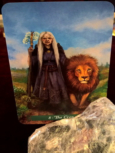 AeonHorus Posted January 23, 2020 Author Posted January 23, 2020 (edited) 8 ~ The Crone:~ We see the Crone in this serene scene with her astrological counterpart Leo. Her lion is tame when he is by her side for he knows that she has nothing but compassion and love for him in her heart, but woe betide any and all who cross her for they will face the wrath of Leo in all his fury. Contrary to popular modern belief compassion is not a weakness to be used and abused, but it is a strength and it has power far greater than anything physical or metaphysical for that matter. The lion in this card stands for power, authority, courage and inner strength. The Crone carries a staff of hawthorn which is imbued with male (yang) energy, yet it is symbolic of fertility and is historically associated with the triple goddess aspect Mother, Maiden, Crone. “A contradiction in terms” I here you say, well with that in mind Hawthorn stands testament to dualities. Tied to the top this staff of Hawthorn is a bunch of Angelica which in itself is an allegory of power and strength. Edited January 23, 2020 by AeonHorus