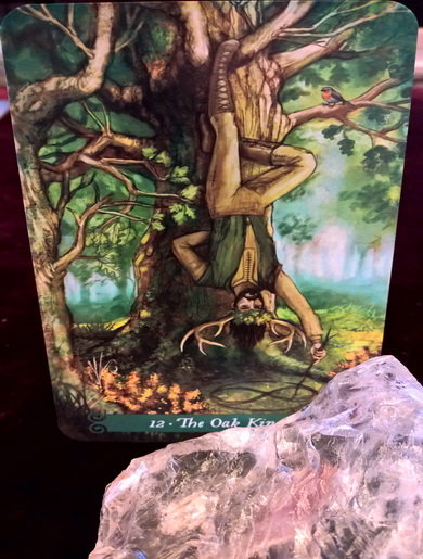 AeonHorus Posted January 23, 2020 Posted January 23, 2020 12~ The Oak King:~ The King of the Oak is hanging in his spiritual place of peace and tranquillity, neither caught nor trapped he just hangs there of his own free will. What is the quandary that he is pondering? Is it a profound and baffling puzzle of the universe or is he simply wondering what to have for his lunch? It doesn’t really matter because the message he is giving is that everything needs to be viewed from a different perspective once in a while. He lavishes upon you the cosmic gift of empathy, the art of walking in someone else’s shoes or quite simply seeing the world through their eyes. He scratches into the dirt above his head a circle to represent nothingness and within the circle he traces the infinity sign which in itself is representative of everything, thus proving that everything is nothing with a little twist! The Oak itself stands for strength, honour and endurance, but we can also see Yellow Gorse that stands for endurance, hope, fertility and rebirth. In the tree perched in a branch looking on, there is a little Robin Red Breast who signifies being aware of changing cycles and messages.