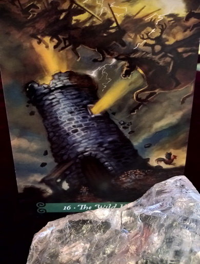 AeonHorus Posted January 24, 2020 Posted January 24, 2020 16 ~ The Wild Hunt:~ This is a classic Tower image but more-so in the respect of CHAOS! We see what looks like the four horsemen of the apocalypse riding into oblivion, lightening crashing all around, light emanating from roof and window. The tower itself looks like it’s about to explode into ten thousand pieces and break itself down into its individual component parts. Piece by piece though, it can be rebuilt into an even stronger framework, standing on its more than substantial foundations. The rooster flapping in sheer panic is there to remind us that with self-confidence, vigilant arrogance and pride we can tear down the diaphanous fabric of our lives and begin to build a better and brighter future. Planted on either side of the door way there are a couple of Rue plants in full flower. Rue is commonly known in magickal circles, for its many uses in spell craft that have strong associations with its historical and traditional uses. Most often worn as a protection against powerful enchantments, especially where the Fae or the Sidhe are concerned, carrying it in an amulet can ensure against others gaining the ability to control one’s mind and spirit. This amulet is a combination of Rowan leaves with Rue and Basil, tied into a golden or a white cloth and carried or worn about the person. Traditionally it is sewn into sachets, along with other powerful herbs, to bring health, power, luck and success, especially when travelling far from home.