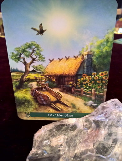 AeonHorus Posted January 24, 2020 Posted January 24, 2020 19 ~ The Sun:~ It is high noon and the sun is at its zenith, there is an eagle soaring in the blue skies above a beautiful thatched cottage with a sunflower garden. The eagle bestows upon us great intelligence, courage and a chance for renewal. The sun is a most auspicious card and brings luck in all aspects of everything we could either wish or hope for. The Sunflowers too are allegorical to spiritual knowledge, good luck, nourishment and focus. The sun is the great life giver but it can also become the great destroyer of everything that we know, but it is all part of the great cycles of the cosmos, without life there is no death but without death there can be no life. There is nothing but pure profusion of all things good in this image here, we see smoke out the chimney, but the fire is not for warmth, it is for the cooking pot which is full from the harvest. There is a cart half full of straw that is set there for repairs to the roof if and when it needs it. Behind the cart the fields are ripe for the picking, as are the sunflowers, indicating that the hard work has all but been done and now, just a few more steps to take and then it will be time to sit back, relax and take life in its stride. There is nothing here but plenty.