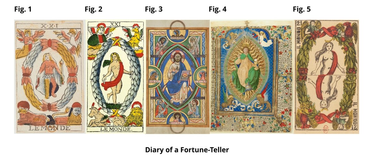 Guest Posted March 2, 2020 Posted March 2, 2020 (edited) Introduction The International Playing-Card Society currently differentiate between two Tarot de Marseille patterns, namely, pattern sheet 1 and pattern sheet 2. For the purposes of the present article, I consider the following versions of pattern sheet 1: a version by Jean Noblet (circa 1659 [1]), a version by Jean-Pierre Payen (1713 [2]), and a version by Jean Dodal (circa 1701 to 1715 [3]). Concerning pattern sheet 2, I consider the following versions, which may be sufficiently representative of the general iconography of the said pattern sheet: a version by Pierre Madenié (1709 [4]), a version by François-Henri (1718 [5]), a version by François Chosson (1736 [6]), a version by Jean-Baptiste Madenié (1739 [7]), a version by François Tourcaty (1745 [8]), a version by Rochus Schär (1750 [9]), a version by Claude Burdel (1751 [10]), a version by Nicolas Conver (1760 [11]), a version by Jacques Rochias (1782 [12]), a version by Arnoux & Amphoux (1793 [13]), and a version by Bernardin Suzanne (circa 1816 to 1868 [14]). In describing the general iconography of the twenty-first trump cards of the aforesaid pattern sheets, I reference the current earliest known version of pattern sheet 1, which is the version by Jean Noblet (1659), and the current earliest known version of pattern sheet 2, which is the version by Pierre Madenié (1709). [Note: images of the twenty-one trump cards of each of the versions of pattern sheet 2 that I list above are currently available for online viewing at http://www.tarot-de-marseille-heritage.com/english/historic_tarots_gallery.html .] Part 1: Descriptions 1.1. Pattern Sheet 1: Jean Noblet In figure 1, a female figure, who would be nude save the cape that she wears and the garland that conceals her genitals, holds in her left hand a sceptre and in her right hand an object that could be described as resembling the head of a spear. The female figure, who looks to the left, is surrounded by a mandorla-like structure that comprises leaves and that is surrounded by four figures that are each depicted as having a halo: at the bottom left of the image is depicted an ox whose head is orientated towards the left, at the top left of the image is depicted a winged human figure whose head is orientated towards the viewer, at the top right of the image is depicted an eagle whose head is orientated towards the right, and at the bottom right of the image is depicted a lion whose head is orientated towards the viewer. 1.1.1. Some Iconographic Differences Between Versions of Pattern Sheet 1 1.1.1.1. In the Version by Jean-Pierre Payen (1713): 1.1.1.1.1. The human figure appears to be rendered as being male (an examination of the fifteenth and the seventeenth trump cards of the present version suggests that the relevant artist or artists are in the habit of depicting clearly the breasts of female figures). 1.1.1.1.2. The head of the winged human figure is orientated towards the right. 1.1.1.2. In the Version by Jean Dodal (circa 1701 to 1715): 1.1.1.2.1. The human figure appears to be rendered as being male (an examination of the fifteenth and the seventeenth trump cards of the present version suggest that the relevant artist or artists are in the habit of depicting clearly the breasts of female figures). 1.1.1.2.2. The object that the aforesaid figure holds in his left hand could be described as resembling a short blade. 1.1.1.2.3. The head of the winged human figure is orientated towards the right. 1.2. Pattern Sheet 2: Pierre Madenié In figure 2, a female figure, who would be nude save for the scarf or the shawl that is draped over her left shoulder and that conceals her genitals, holds in each hand a sceptre as she balances on her right leg. The female figure, who looks to the left, is surrounded by a mandorla-like structure that comprises leaves and that is surrounded by four figures that are each depicted as having a halo: at the bottom left of the image is depicted an ox whose head is orientated towards the left, at the top left of the image is depicted a winged human figure whose head is orientated towards the right, at the top right of the image is depicted an eagle whose head is orientated towards the right, and at the bottom right of the image is depicted a lion whose head is orientated towards the viewer. 1.2.1. Some Iconographic Differences Between Versions of Pattern Sheet 2 1.2.1.1. In the Versions by François-Henri (1718), by Nicolas Conver (1760), by François Tourcaty (1745), and by Arnoux & Amphoux (1793): 1.2.1.1.1. The object that the female figure holds in her right hand is not easily identified. 1.2.1.2. In the Version by François Chosson (1736): 1.2.1.2.1. The object that the female figure holds in her right hand could be described as resembling the head of a spear. 1.2.1.3. In the Version by Bernadin Suzanne (1839): 1.2.1.3.1. The head of the winged human figure is orientated more towards the viewer. 1.2.1.3.2. The head of the lion is orientated slightly towards the right. Part 2: Interpretations 2.1 Concerning the General Iconography The general iconography of the twenty-first trump cards of patterns sheets 1 and 2 could be explained as a variation of an iconographic type that is designated Christ in Majesty. In figure 3, which is a scan of an illustration that is dated circa 1170 [15], Christ is surrounded by a mandorla as he sits on an arc. Surrounding the mandorla are the following figures, which I list clockwise: directly below the feet of Christ is depicted a reference to Matthew; following the reference to Matthew is depicted a representation of Moses; following the representation of Moses is depicted a lion in reference to Mark; following the reference to Mark is depicted a representation of Baruch; following the representation of Baruch is depicted an eagle in reference to John; following the reference to John is depicted a representation of Jeremiah; following the representation o