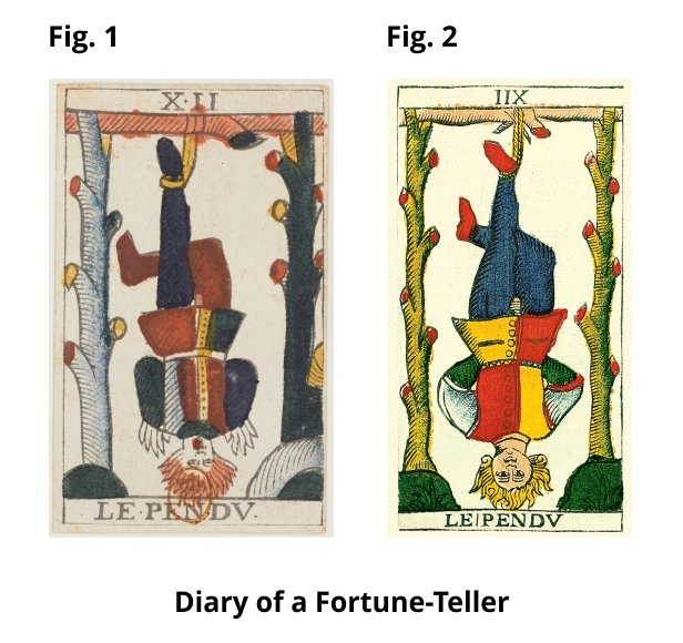 Guest Posted March 4, 2020 Posted March 4, 2020 (edited) Introduction The International Playing-Card Society currently differentiate between two Tarot de Marseille patterns, namely, pattern sheet 1 and pattern sheet 2. For the purposes of the present article, I consider the following versions of pattern sheet 1: a version by Jean Noblet (circa 1659 [1]), a version by Jean-Pierre Payen (1713 [2]), and a version by Jean Dodal (circa 1701 to 1715 [3]). Concerning pattern sheet 2, I consider the following versions, which may be sufficiently representative of the general iconography of the said pattern sheet: a version by Pierre Madenié (1709 [4]), a version by François-Henri (1718 [5]), a version by François Chosson (1736 [6]), a version by Jean-Baptiste Madenié (1739 [7]), a version by François Tourcaty (1745 [8]), a version by Rochus Schär (1750 [9]), a version by Claude Burdel (1751 [10]), a version by Nicolas Conver (1760 [11]), a version by Jacques Rochias (1782 [12]), a version by Arnoux & Amphoux (1793 [13]), and a version by Bernardin Suzanne (circa 1816 to 1868 [14]). In describing the general iconography of the twelfth trump cards of the aforesaid pattern sheets, I reference the current earliest known version of pattern sheet 1, which is the version by Jean Noblet (1659), and the current earliest known version of pattern sheet 2, which is the version by Pierre Madenié (1709). [Note: images of the twenty-one trump cards of each of the versions of pattern sheet 2 that I list above are currently available for online viewing at http://www.tarot-de-marseille-heritage.com/english/historic_tarots_gallery.html .] Part 1: Descriptions 1.1. Pattern Sheet 1: Jean Noblet In figure 1, a male figure, who is suspended by his left foot, sticks out his tongue as he hangs from gallows that comprise a horizontal tree trunk that is held in place by two vertical tree trunks. The arms of the male figure, which are crossed behind his back, are folded in such a manner that the digits of each of his hands are visible behind his shoulders: the five digits of his left hand are visible behind his right shoulder and the five digits of his right hand are visible behind his left shoulder. It would appear that penis of the subject is exposed. 1.1.1. Some Iconographic Differences Between Versions of Pattern Sheet 1 1.1.1.1. In the Version by Jean-Pierre Payen (1713) and by Jean Dodal (circa 1701 to 1715): 1.1.1.1.1. Only four of the digits of each hand are depicted. 1.1.1.1.2. The representation of the penis of the male figure, which is distinguishable from negative space owing to the depiction of horizontal lines, is so rudimentally rendered as to be obscure. [Note: the rudimentary depiction of the penis of the male figure may be the result of uncertainty. Alternatively, and since the genitals of a human figure are nowhere else portrayed in the versions of pattern sheet 1 by Payen and by Dodal, the rudimentary depiction of the penis of the male figure may be the result of the conservative inclinations of the artist or artists, the conservative inclinations of the relevant markets, or both.] 1.2. Pattern Sheet 2: Pierre Madenié In figure 1, a male figure, who is suspended by his left foot, sticks out his tongue as he hangs from gallows that comprise a horizontal tree trunk that is held in place by two vertical tree trunks. The arms of the male figure are folded behind his back and he wears a shoe on only his right foot. It would appear that the penis of the subject, which is rudimentally rendered, is exposed. 1.2.1. Some Iconographic Differences Between Versions of Pattern Sheet 2 1.2.1.1. In the Versions by François-Henri (1718) and by François Chosson (1736): 1.2.1.1.1. One could argue that the tongue of the male figure is not extended. 1.2.1.1.2. It would appear that the male figure wears a shoe on each foot. 1.2.1.2. In the Version by Nicolas Conver (1760): 1.2.1.2.1. The penis of the male figure is not exposed. 1.2.1.3. In the Version by Jacques Rochias (1782): 1.2.1.3.1. The male figure wears a shoe on each foot. 1.2.1.3.2. The penis of the male figure is rendered to resemble a triangle. 1.2.1.4. In the Versions by Arnoux & Amphoux (1793) and by Bernadine Suzanne (circa 1816 to 1868): 1.2.1.4.1. One could argue that the male figure wears a shoe on each foot. Part 2: Interpretations 2.1 Pitture Infamanti (Defamatory Paintings) The general iconography of the twelfth trump cards of pattern sheets 1 and 2 resembles the iconography of Italian pitture infamanti, in which a subject may be depicted as hanging by one foot [15] [16]. In her book, Tarot Cards painted by Bonifacio Bembo for the Visconti Sforza Family, Gertrude Moakley describes the events that led to the relevant Pope ordering that the father of Francesco Sforza, one Muzio Attendolo, be depicted on the bridges and on the gates of Rome as hanging by his right foot [17]. In doing so, Moakley may have become the first English-speaking researcher to explain in the context of Italian pitture infamanti the iconography of the corresponding trump card of the pattern sheet that is attributed to Bembo. Italian defamatory paintings, which were generally displayed in public [18][19][20][21], depicted such persons as include defaulters [22], bankrupts, and traitors [23][24]. Notes: 2.1.1. The depiction of an extended tongue could be explained as a reference to the contempt that may demonstrated by means of one or more acts of betrayal or to the lack of remorse that may thereafter be demonstrated. On page 10 of his book, Public Painting and Visual Culture in Early Republican Florence, George Bent describes a defamatory painting of one Ridolfo Varana in which Varana, who is charged with having switched sides during the War of the Eight Saints, is depicted as "giving the finger" to the Church and to the commune. 2.1.2. Given the public nature of Italian pitture infamanti, the depiction of the penis of a male subject could be explained as a potential means of 