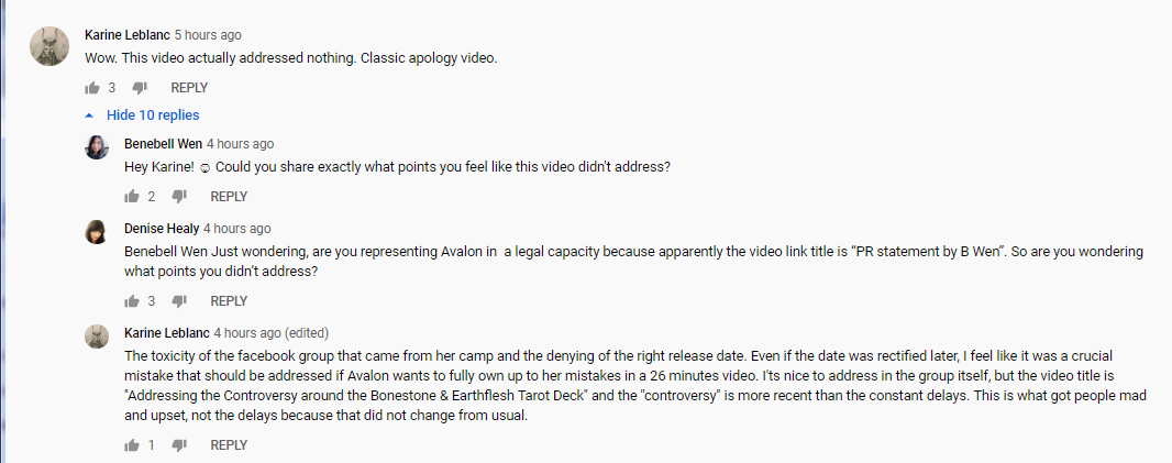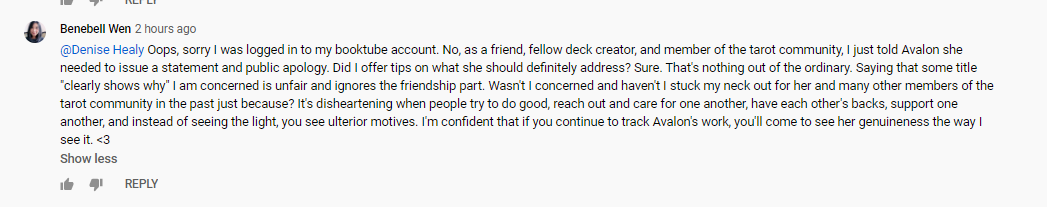 Raggydoll Posted June 13, 2020 Posted June 13, 2020 10 minutes ago, gregory said: From the post with her long long apologia. But there's something odd about that video - look at the comments: what an odd title. and later: I don't care if it has an extra card. I don't care if it goes mass market later. When you buy a limited first edition you always run that risk. I just hope Benebell is right here. And I also hope that if she's a lawyer - as someone has said somewhere in all this - and also Avalon's friend, she will manage to steer Avalon towards delivering. Yes I was actually relieved when Avalon said in her video that she is now getting help from her friends and I was not surprised that Benebell helped her to initiate that video. I think it was a good and much needed move. Despite that there will always be those that pick that video apart, and there will always be some things that could have been phrased better or done better. But it seems like Avalon is now taking her mental health seriously and is both looking after her own well-being as well as enlisting experienced friends to help with the completion of this deck project. It wouldn't surprise me if Ethony is helping her out too. She is after all a very experienced deck creator and she seem to be very structured and used to managing many projects simultaneously (just like Benebell).