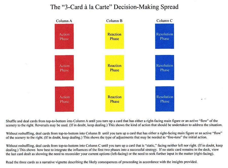 Barleywine Posted April 11, 2020 Posted April 11, 2020 (edited) Most of you know that I'm not a fan of 3-card readings since I think they take too narrow a slice of the deck and tell too shallow a story. If I use them, I prefer to extract the cards from a larger population of drawn cards using some kind of a "pointer." In this case I'm relying on the nominal "facing" of the figures or landscape features on the cards in each of three positions to determine which of them to read in the columns. (This is what used to be called a "Chinese menu" approach ["I'll have one from Column A, one from Column B and one from Column C"], but I imagine that is now politically incorrect.) The first two cards use rightward orientation to progress the reading, while the last card is "static" (facing neither left nor right) to reflect the end (and the resolution) of the matter. Reversal can be used with this spread, which may also switch the normal upright facing and alter the flow of the cards. Cards are dealt top-to-bottom into each column until a card of the correct facing turns up. When that happens, the deal moves on to the next column. If there are no static cards remaining in the deck when the third column is dealt, the last card pulled should be taken to mean that the initial assumptions must be reconsidered if it is left-facing, or that further input should be sought before taking any action if it faces to the right. Since the deck will have been exhausted at this point, precluding clarifiers, there are a couple of choices: do another reading using a second deck and a different spread to extend the outlook; pull the clarifiers from another deck; or use the "quintessence" to obtain a "roll-up" perspective on the situation. My personal choice would be the first one. Edited April 11, 2020 by Barleywine