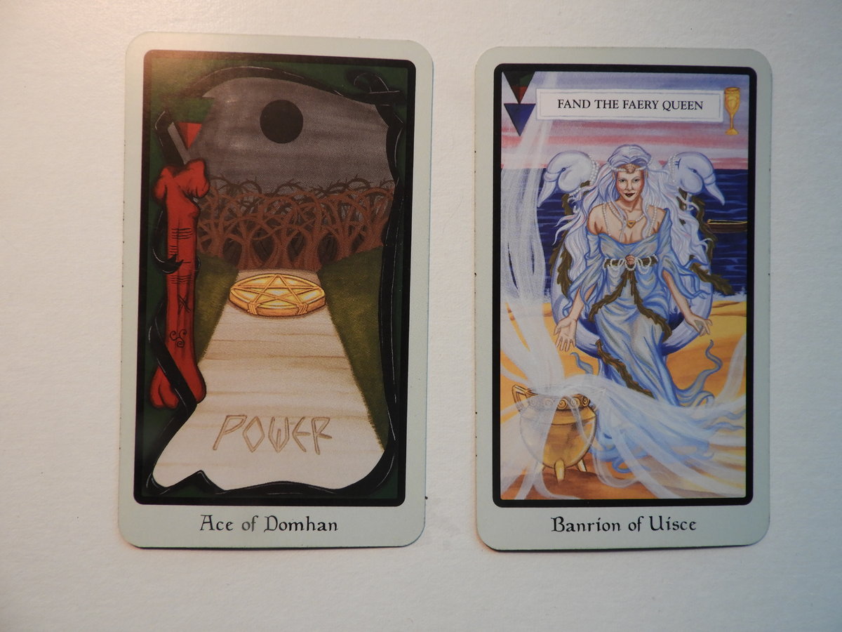 Mi-Shell Posted May 30, 2020 Posted May 30, 2020 Using the weekly spread, that I posted above: 1-What opportunities should I look for this week - in my physical world? 1 Ace of Domham this seems to be the Ace of Coins/ Pentacles I see a LARGE red bone engraved with ? Ogham an X and a partial Triskelion. There is a black moon over a dark, leafless tangled Wood- a barrier- to keep someone out or keep someone in?? The golden pentacle is resting just where it begins on a broad path. The word Power immediately lets me think:”do I need any Power?? NO! In my life and my shamanic work I have more than enough of that and oftentimes power is more of a devious obstacle – like the wood tangle – than a help. This however pertains to my physical realm = me sitting at home during lock-down.... Just as I was thinking, that actually, I am OK with that – Wrump – the Power went out!! Here in Canada, Electricity is called “Power” or even more often “Hydro”, since it comes from hydroelectric. Yes, THAT power I would like to come back as soon as possible! I / we might have a big red bone to pick with the local power company: Every time it rains and most often in a thunderstorm like the one right now, our power goes out...... So, I am now sitting in my tangled woods, waiting for my Power to re-appear..... ......so I can post this first reading. 2- What opportunities should I look for this week - in my none physical world / realm ? Banrion of Uisce!?? What is That? The Queen of Cups? The card also says: Fand, the Faery Queen She is wearing a rather skimpy dress – for her age - and I notice she sits by the sea next to a golden caldron out of which “fumes of some sort” are rising up. I hope, it is lots of mosquito spray, because in this parts she will need that dearly right now – But luckily, she seems to be in the Otherworld and her smile encourages me to enter her realm, the realm of this deck and explore. That I will do with gusto! It is the opportunity I have been waiting for. With no “power” and pooooouring rain outside, it is the ideal time to stick my nose into the book of Fairie Wicca.