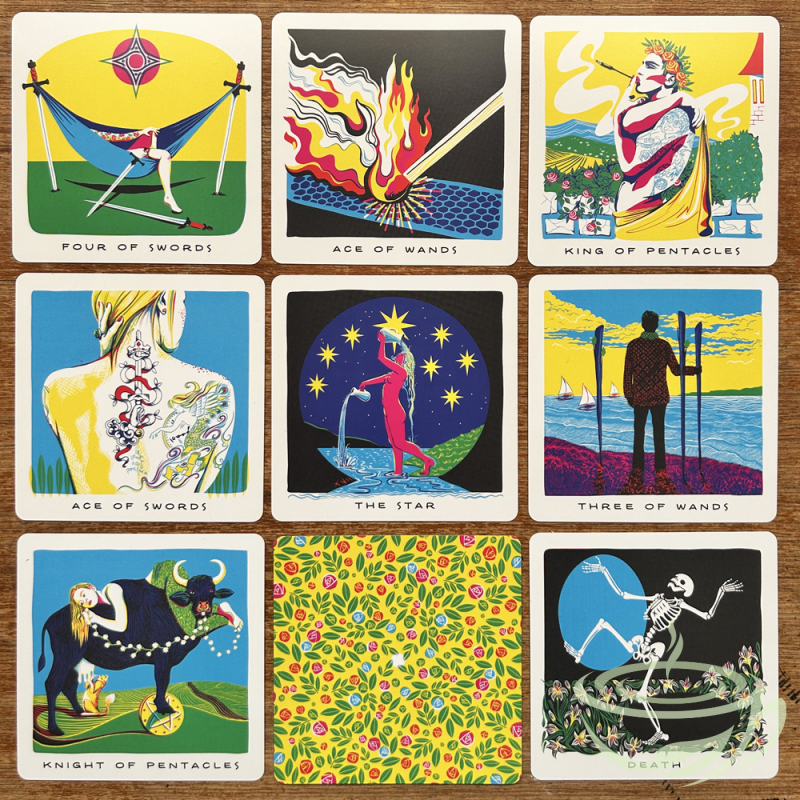From the review "Just look at this bright little bundle of joy!... Make no mistake, despite the exuberant, fun style and colours, this is not a lightweight (nor even particularly gentle) deck – it definitely doesn’t pull its punches. The Bon Sequitur was created by graphic artist and printmaker Zephyr Pfotenhauer in the aftermath of her husband’s sudden death. She describes the process of making the deck as a way to 'build another life from the rubble of the old: piece by piece, card after card.'”