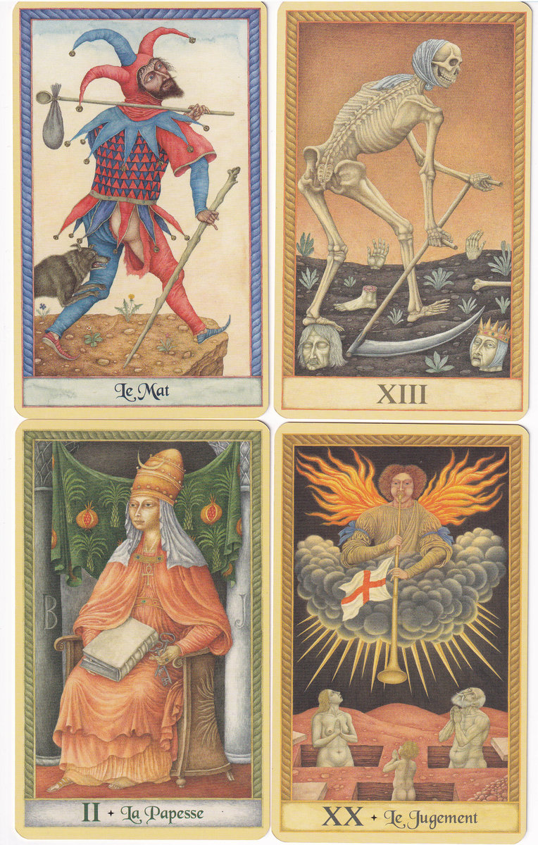 I swear I first saw this deck here and that was what prompted me to hunt it down - but I cannot find the thread. It is slightly different from the version described here https://tarot-heritage.com/2015/11/13/the-readers-digest-capek-tarot-de-marseille/#more-1357 in that the titles do not have the added symbols and the book (with gold edged pages) I got is by Emilie Porte. (In French, but I can hack that - and the book seems decent. None of the stuff Sherryl objects to. It's rather lovely, and you can find it in several places on line. For a ghastly moment I had thought I was getting something else entirely - long story - but no !