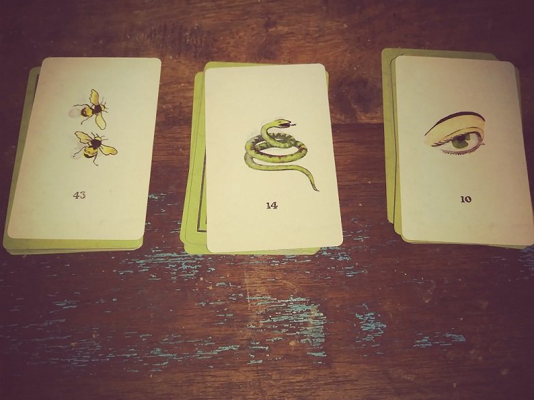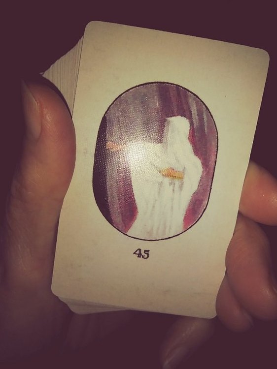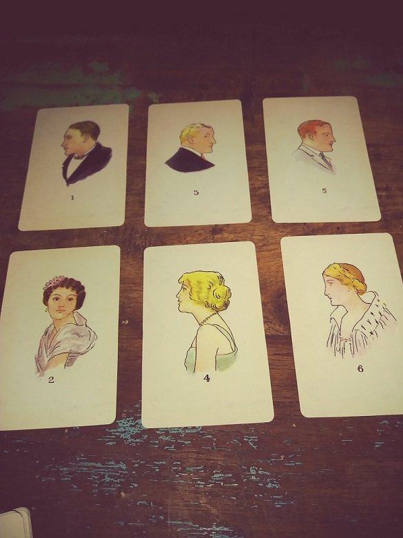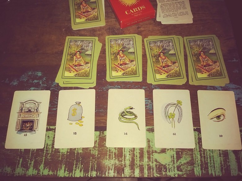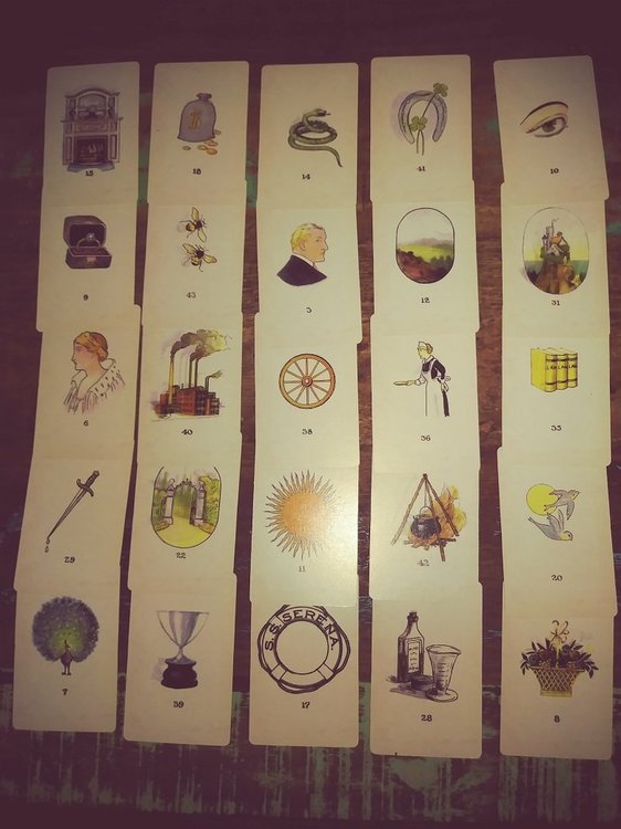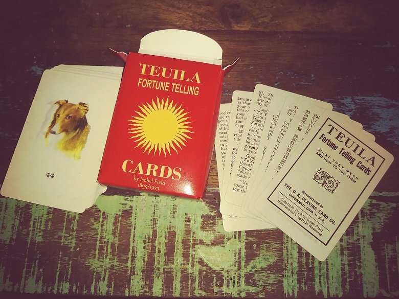 This is a reproduction of a 1923 deck by Isobel Field, Robert Louis Stevenson's stepdaughter. She also has an autobiography called This Life I've Loved. I've also seen mention of Teulia cards with an 1899 copyright to Isobel Strong (Strong was her surname at that time), but I think she redrew at least some of the cards for the 1923 version. The people cards look very 1920's. No. 2 has finger waves and No. 4 has one of those faux bobs, with the hair gathered into a chignon. I've seen this hairstyle on a lot of women in silent movies.But iIn 1899, people didn't look like this. The men generally had more facial hair, and the ideal for women was the Gibson girl in a high collar and a big, poofy pompadour. Those people cards are other people, the sitter is represented by 45, Fate, a white-robed figure pulling aside a curtain: The deck comes with 13 pages of instructions printed on 7 cards. You get meanings, suggested meanings, and a 3 + 25 card spread. You can read the salient information from LWB here. " To do a reading, have the person make a mental wish while shuffling the cards, then cut the deck twice to make three piles on the table. The top card on each deck defines the outlook." Oh, dear. Someone is going to make trouble at work: " Have the querent put the cards back, reassemble the pack, cut once. The reader takes the pack and lays out five cards face down in a row on the table. Discards 5. Deals 5 more on top of the other five. Discards 5. Keeps going until all the deck is dealt. There are now five divisions of five cards each." The backs are lovely: And here is the full spread: Teuila cards are available at The Cartomancer.